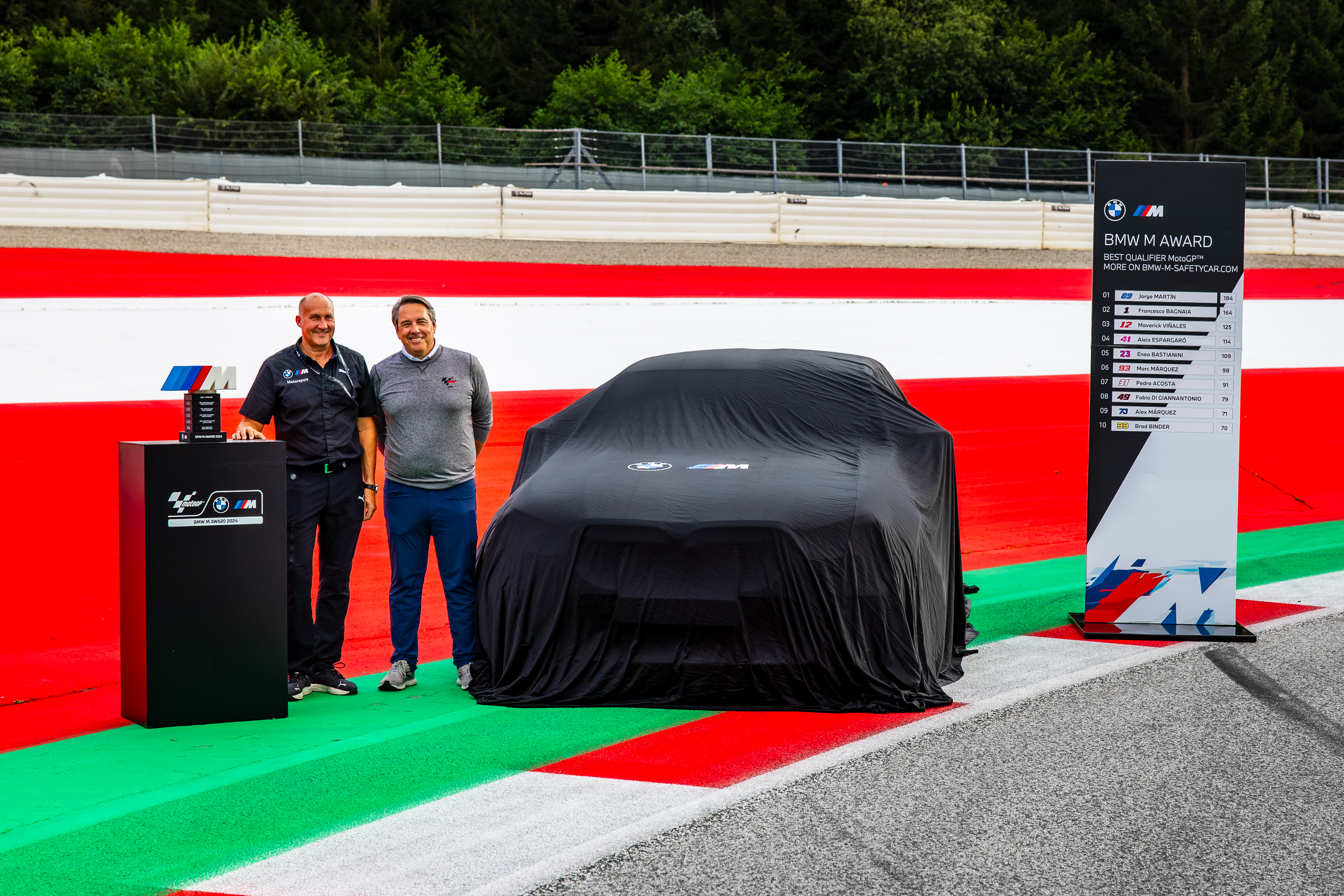 Spielberg (AUT), 15th August 2024. BMW M GmbH, 2024 BMW M Award, MotoGP™. Unveiling 2024 winner's car BMW M5, Axel Mittler, Marketing Manager MotoGP™ at BMW M GmbH, Dan Rossomondo, Chief Commercial Officer at MotoGP™ rights holder Dorna Sports.