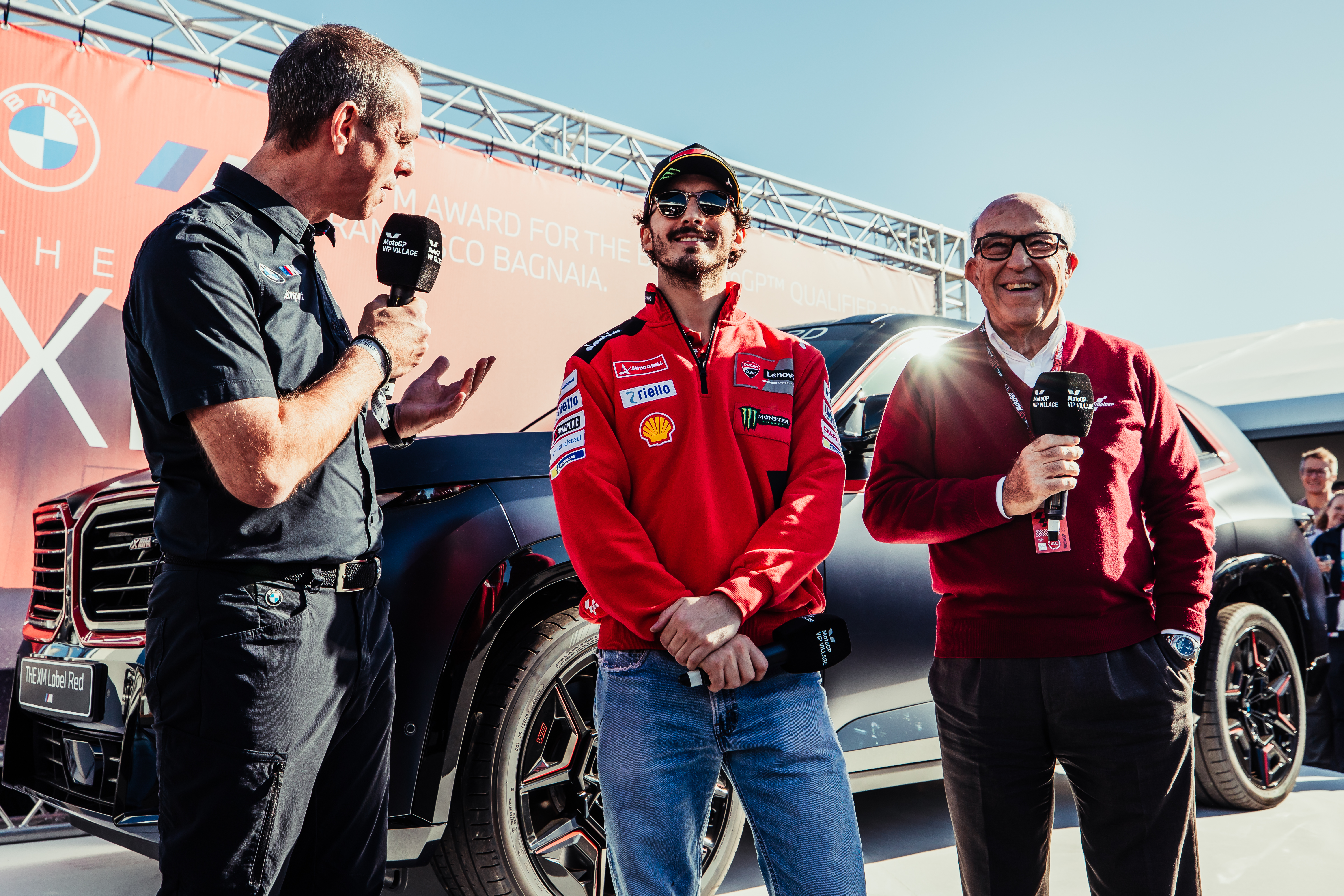 Valencia (ESP), 25th November 2023. BMW M GmbH, 2023 BMW M Award, MotoGP™. Franciscus van Meel, CEO of BMW M GmbH, winner Francesco Bagnaia (ITA), Carmelo Ezpeleta, CEO of Dorna Sports, winner's car BMW XM Label Red.