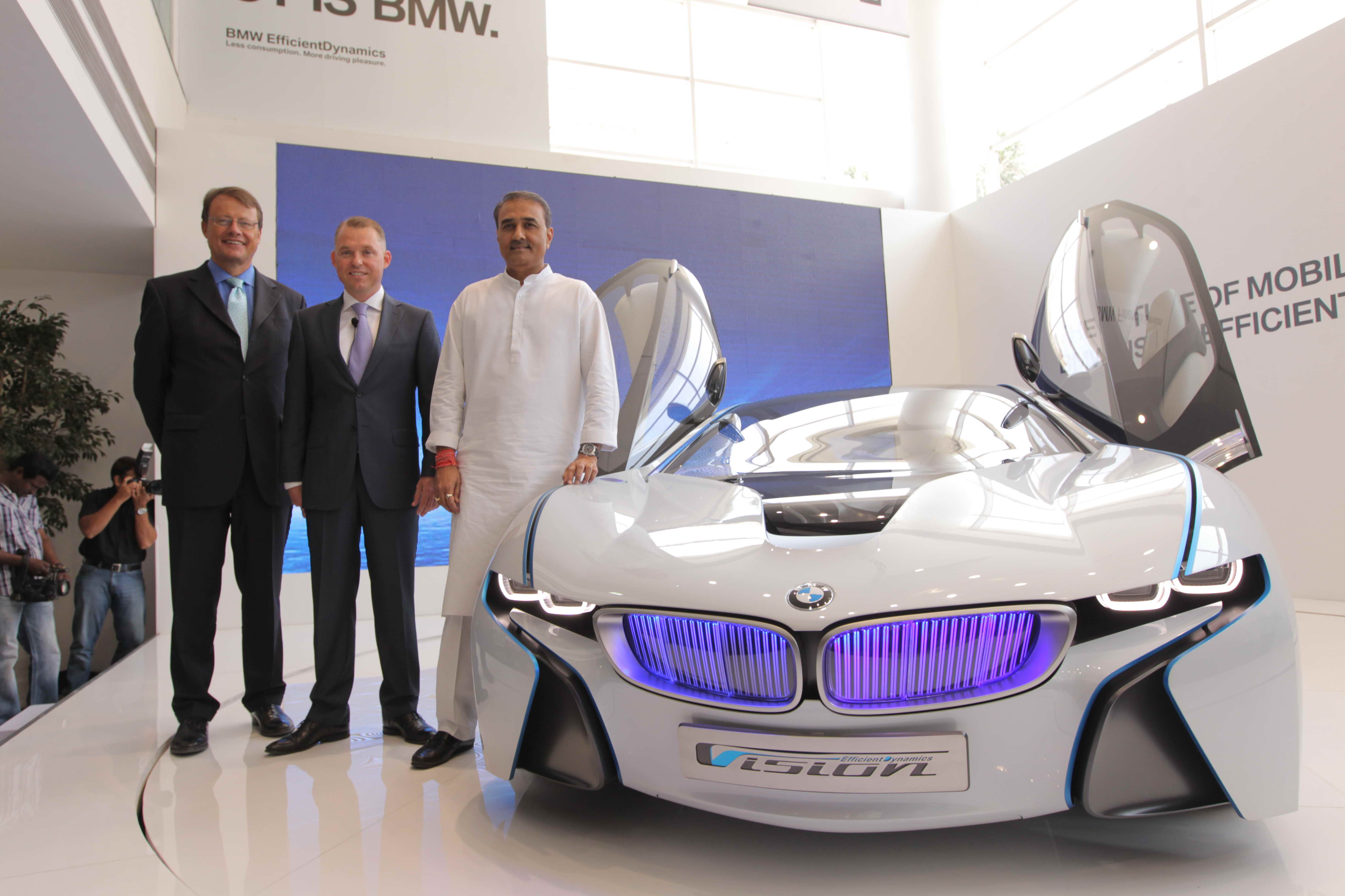 Mr. Praful Patel, Mr. Thomas Matussek and Dr. Andreas Schaaf with The BMW Vision concept car (02/2022)