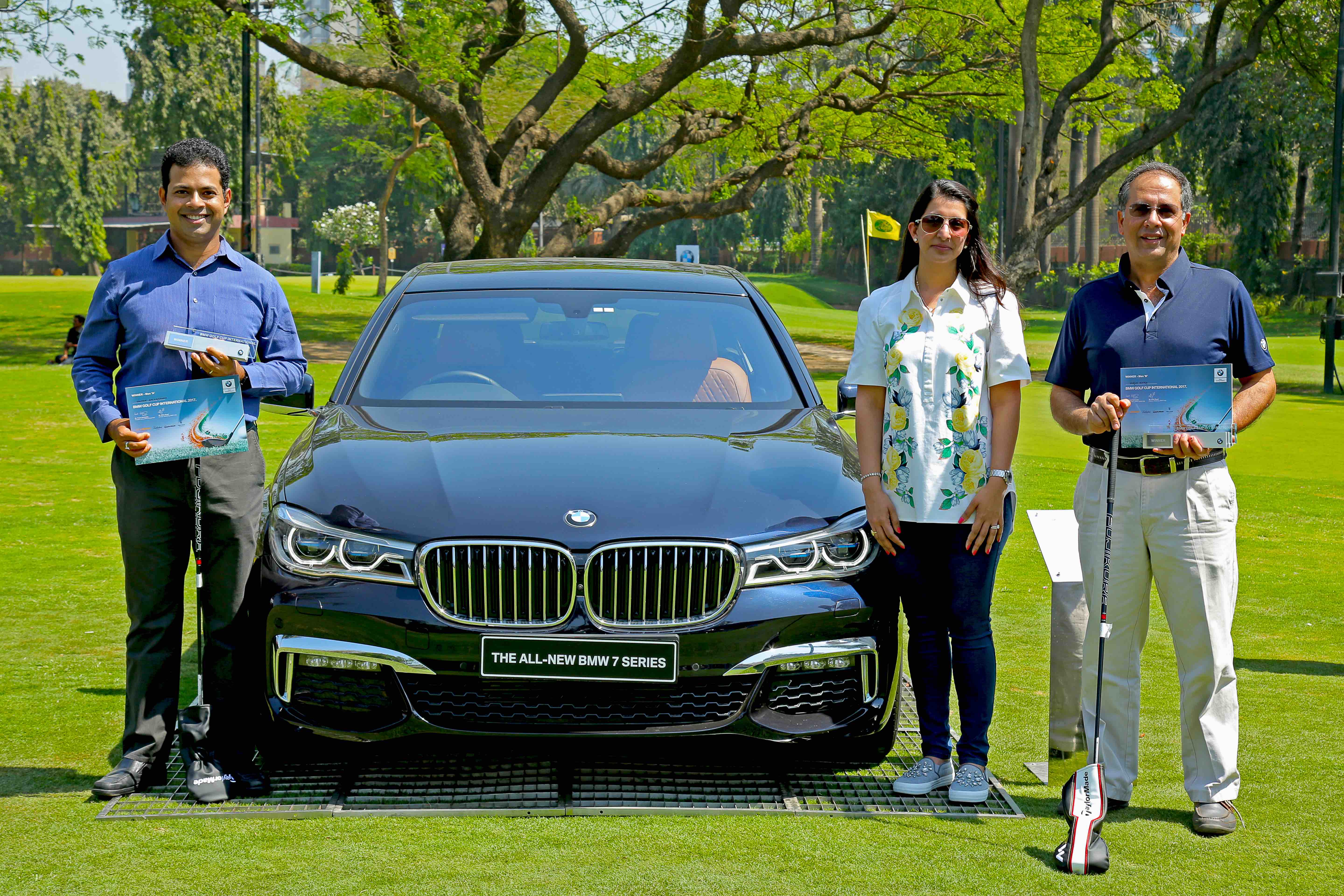 L-R) Mr. Gautam Balakrishnan, Ms. Pooja Choudary - Managing Director at Infinity Cars, Mr. Varun Batra with the all-new BMW 7 Series (03/2022)