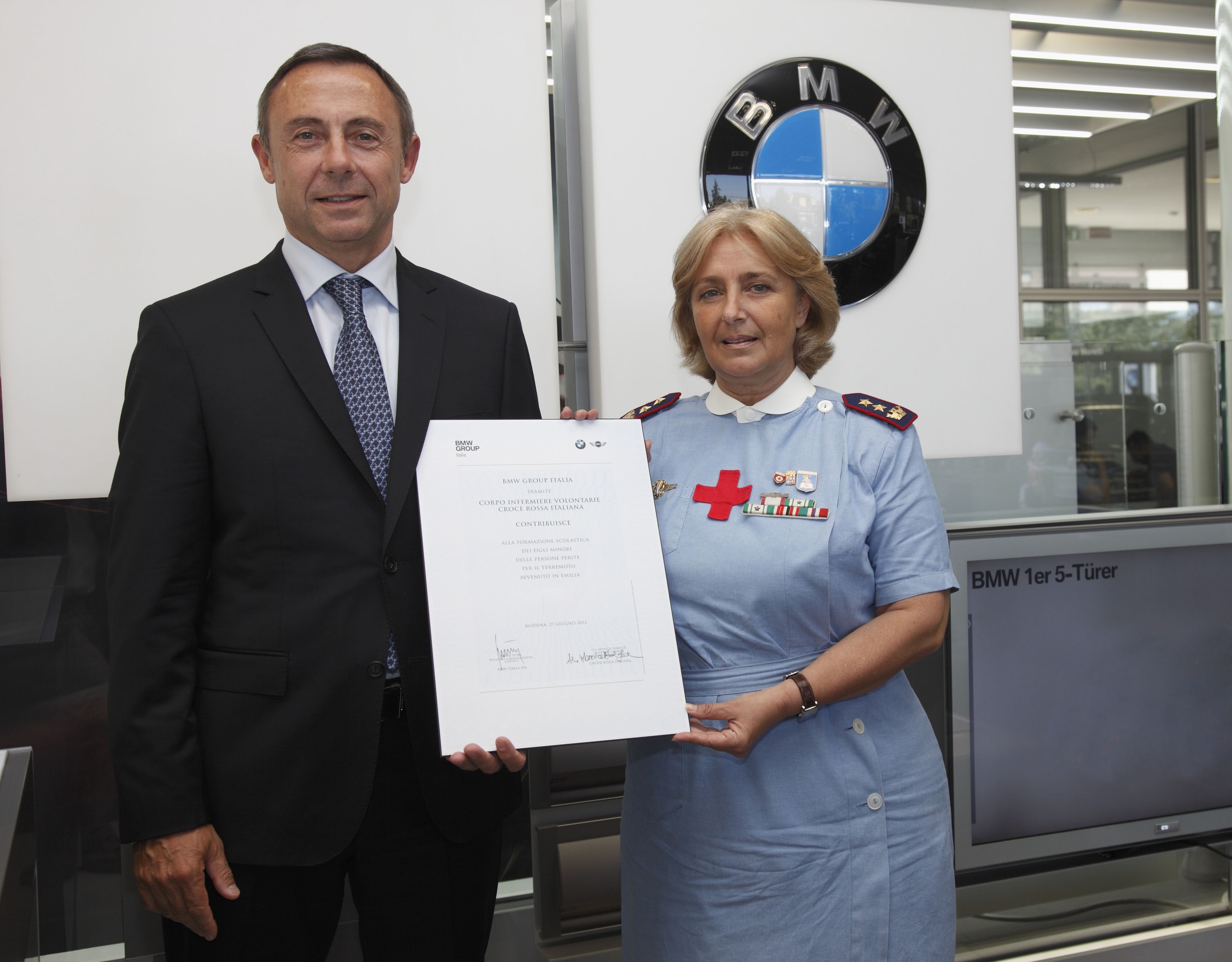 Franz Jung, Presidente e AD di BMW Italia, e Sorella Monica Dialuce Gambino, Segretaria Generale del Corpo Infermiere Volontarie della Croce Rossa Italiana, durante la cerimonia ufficiale di donazione presso la concessionaria BMW a Modena (07/2012)