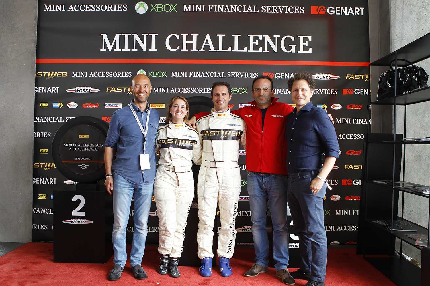 MINI Challenge 2016 - Imola - da sinistra, Carlo Botto Poala (Marketing Manager MINI); Rachele Somaschini (2° gara 1 + gara 2 MINI Cooper S); Fabrizio Ongaretto (1° gara 1 + gara 2 MINI Cooper S); Nicola Franzoso (3° Classificato gara 1 + gara 2 MINI Cooper S); Federico Izzo (Head of MINI Italy).
