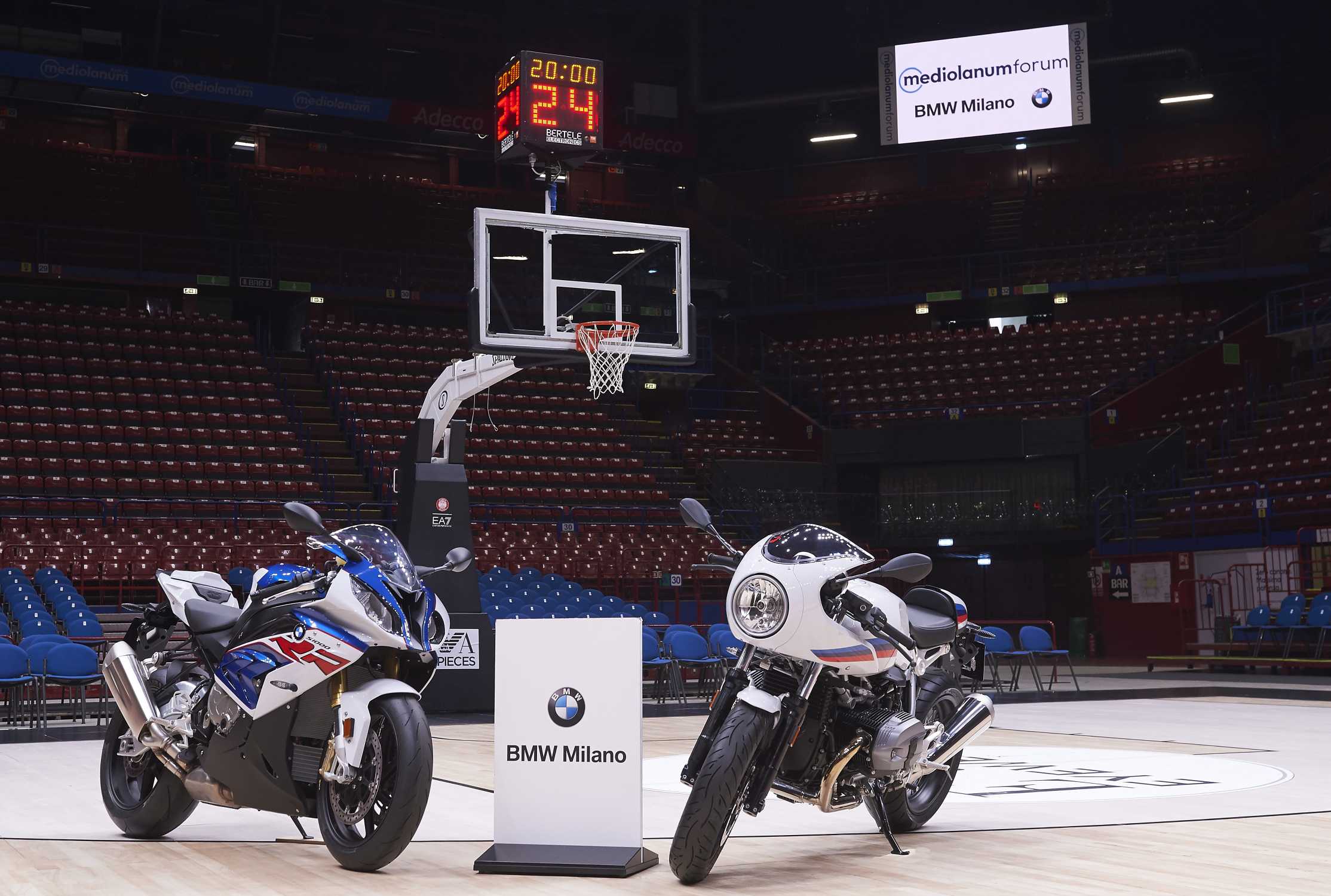 Milano, 23 febbraio 2017. Mediolanum Forum Milano. BMW Motorrad Milano inaugura l'inizio della BMW Motorrad Never Ending Season con i grandi campioni della EA7 Olimpia Milano. A sinistra, la BMW S 1000 RR; a destra, la BMW S 1000 R (02/2017).