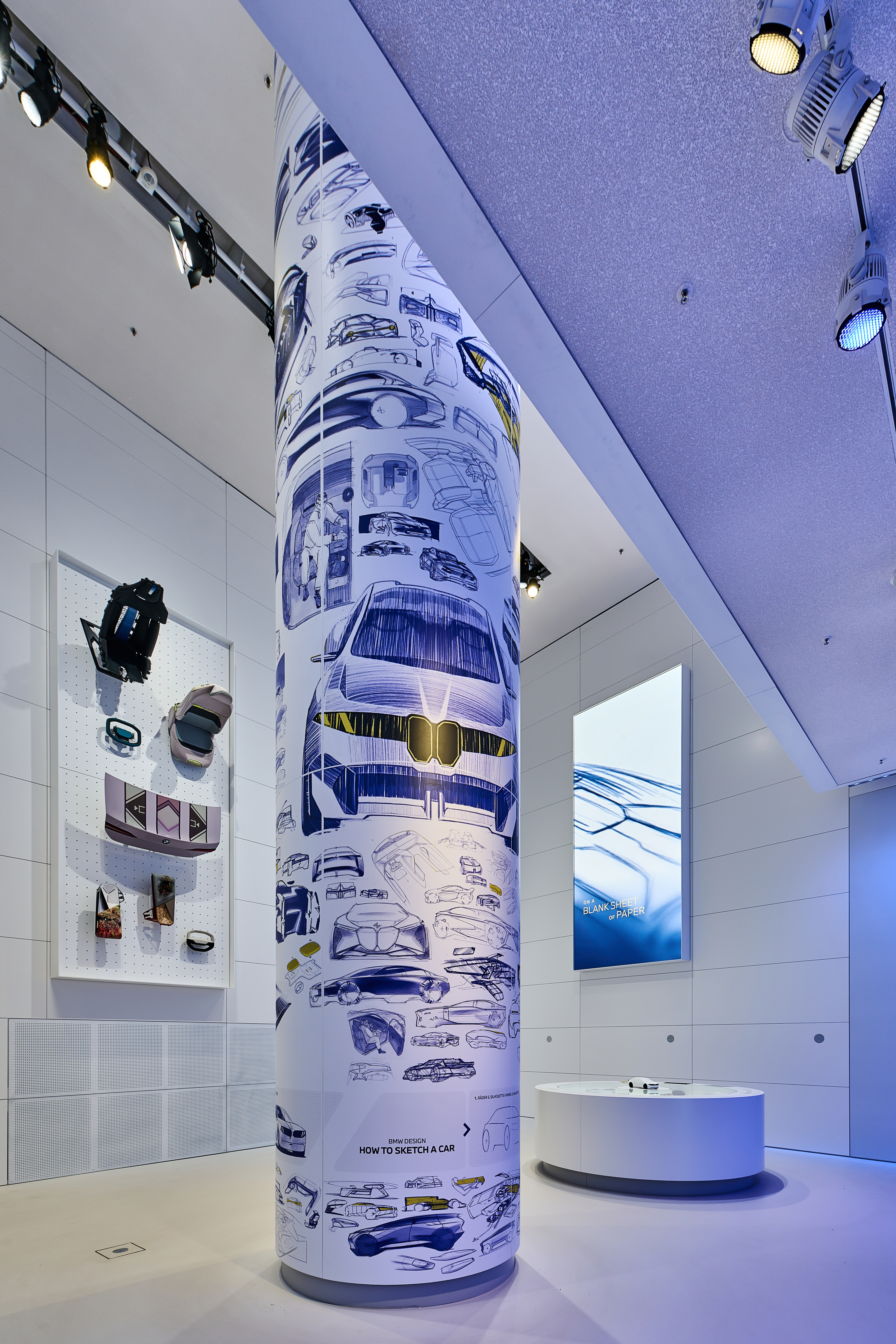 BMW Museum. Haus des Design. Neu kuratierter Raum „Atelier“ mit Blick auf die Exponaten-Wand, die Skizzensäule, den Designfacettentisch und die ...