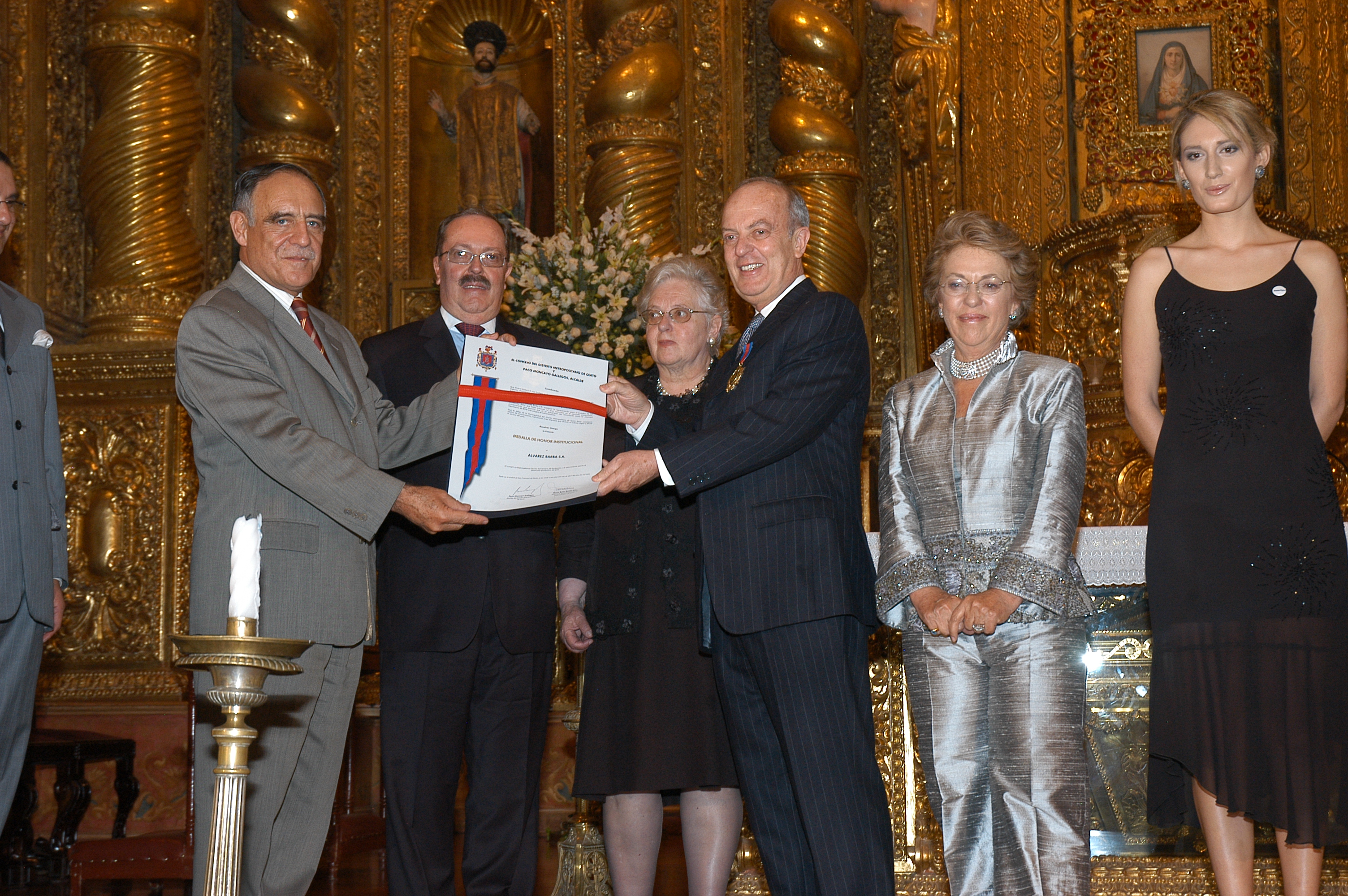 Entrega de diploma de conmemoración para Alvarez Barba por su 75avo aniversario por parte del Alcalde de la ciudad de Quito, el General Paco Moncayo. Lo reciben los principales accionistas de Alvarez Barba. De izquierda a derecha - accionistas Alvarez Barba. Cesar Alvarez, María Alvarez, Pedro Alvarez (Presidente de Alvarez Barba) y Susana Alvarez. Año 2007 (06/2017)
