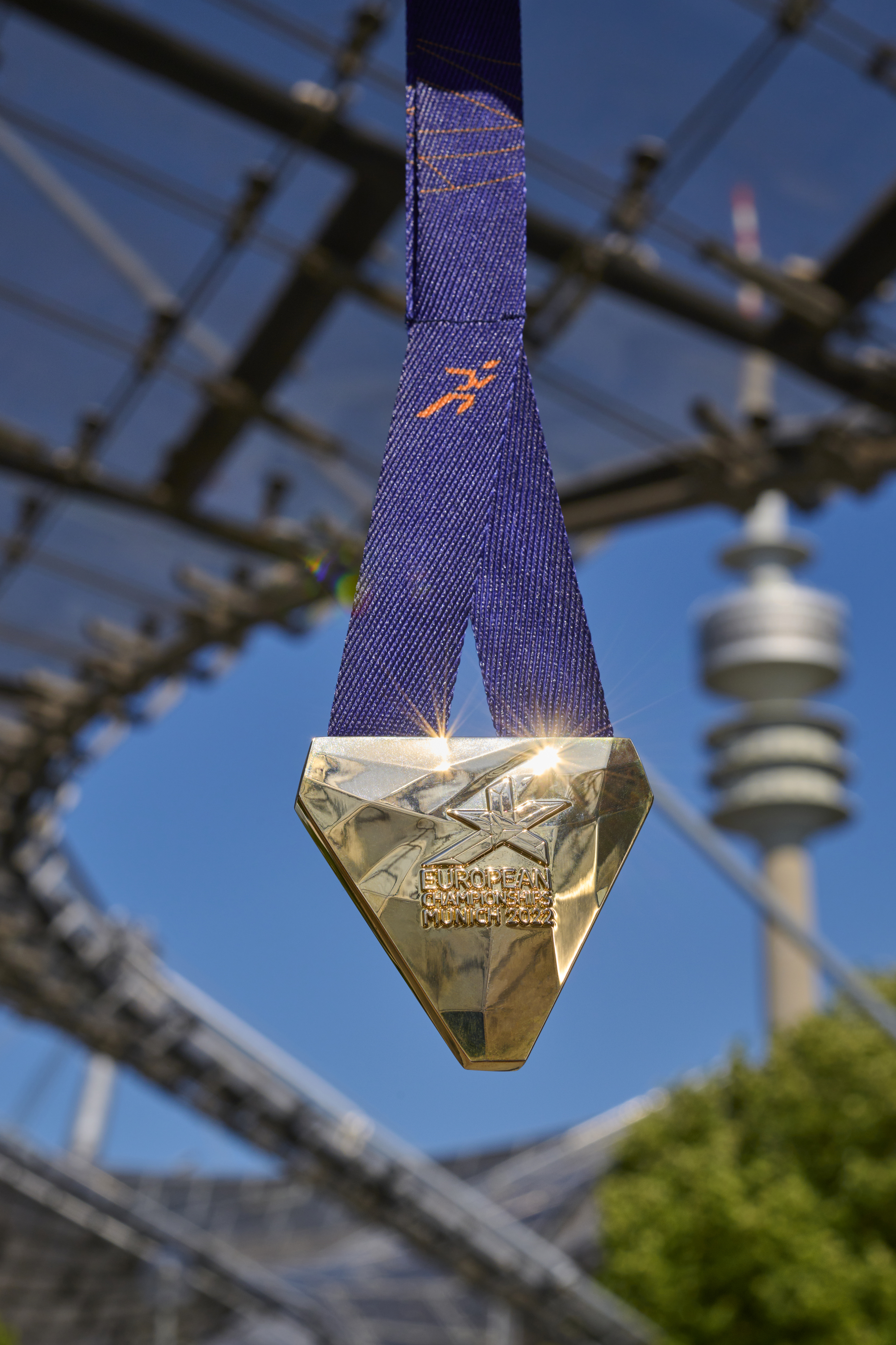 European Championships Munich 2022 – Gold Medal with band in front of the Olympic Tower (07/2022).