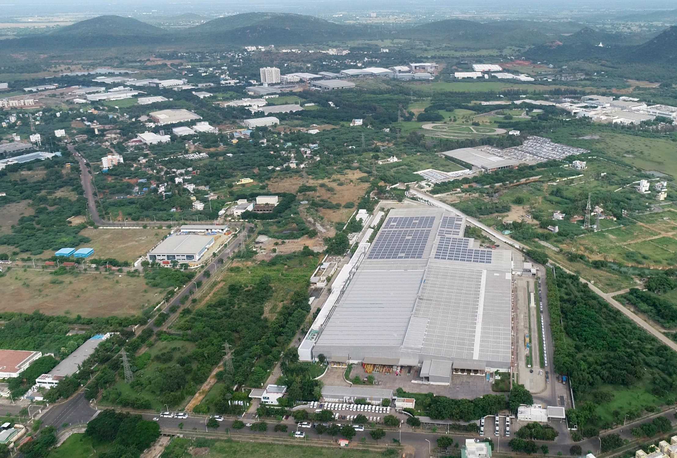 Aerial view of the high-voltage battery assembly plant in Irlbach-Straßkirchen, with the Energy Center and the Fire Station in the foreground. ...
