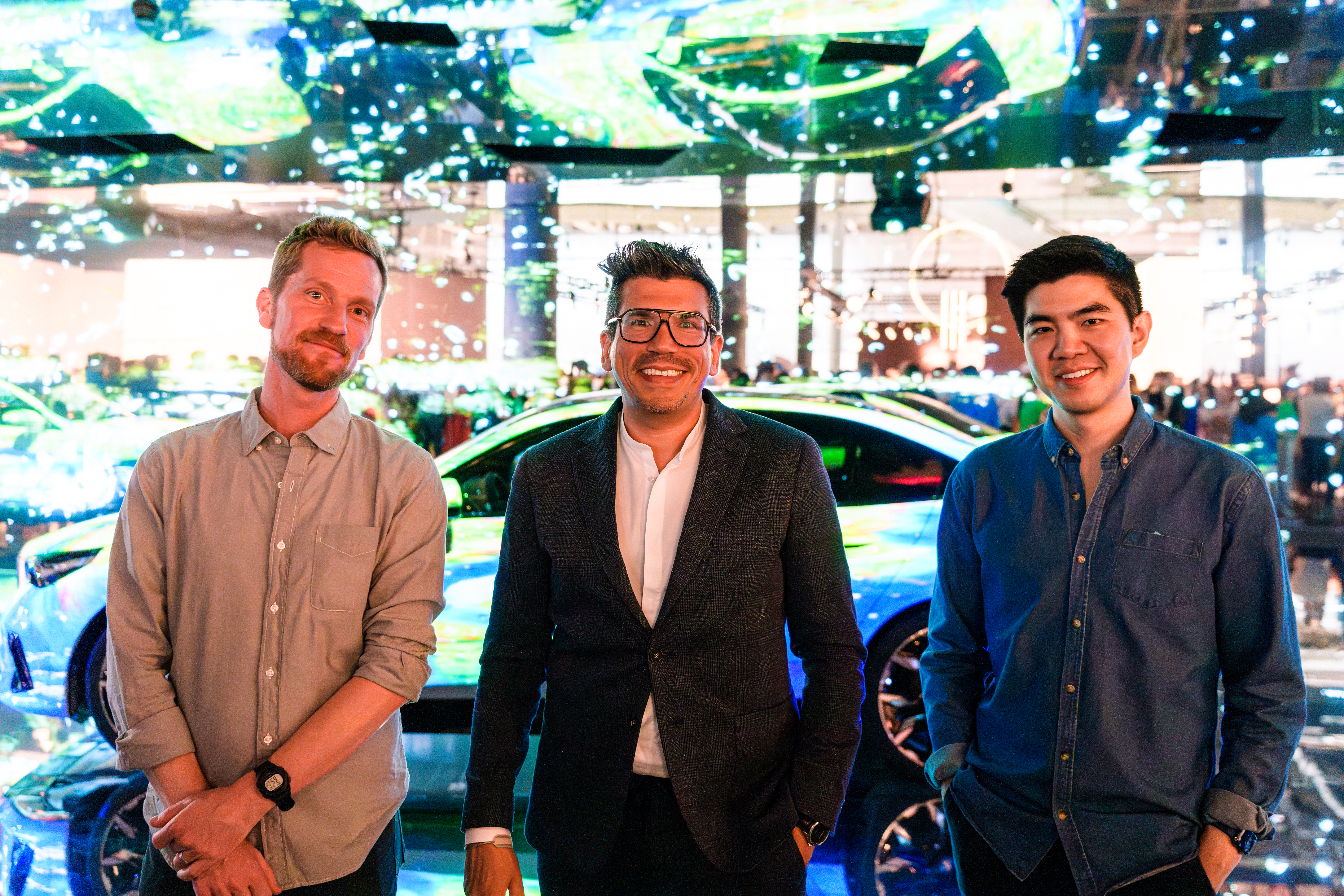 "The Electric AI Canvas" at Art Basel in Basel 2023. f.l.t.r.: Nathan Shipley (Goodby, Silverstein & Partners), Stefan Ponikva (Vice President BMW Brand Communication and Brand Experience) and Gary Yeh (ArtDrunk). Photo: Mike Nimtsch (06/2023)