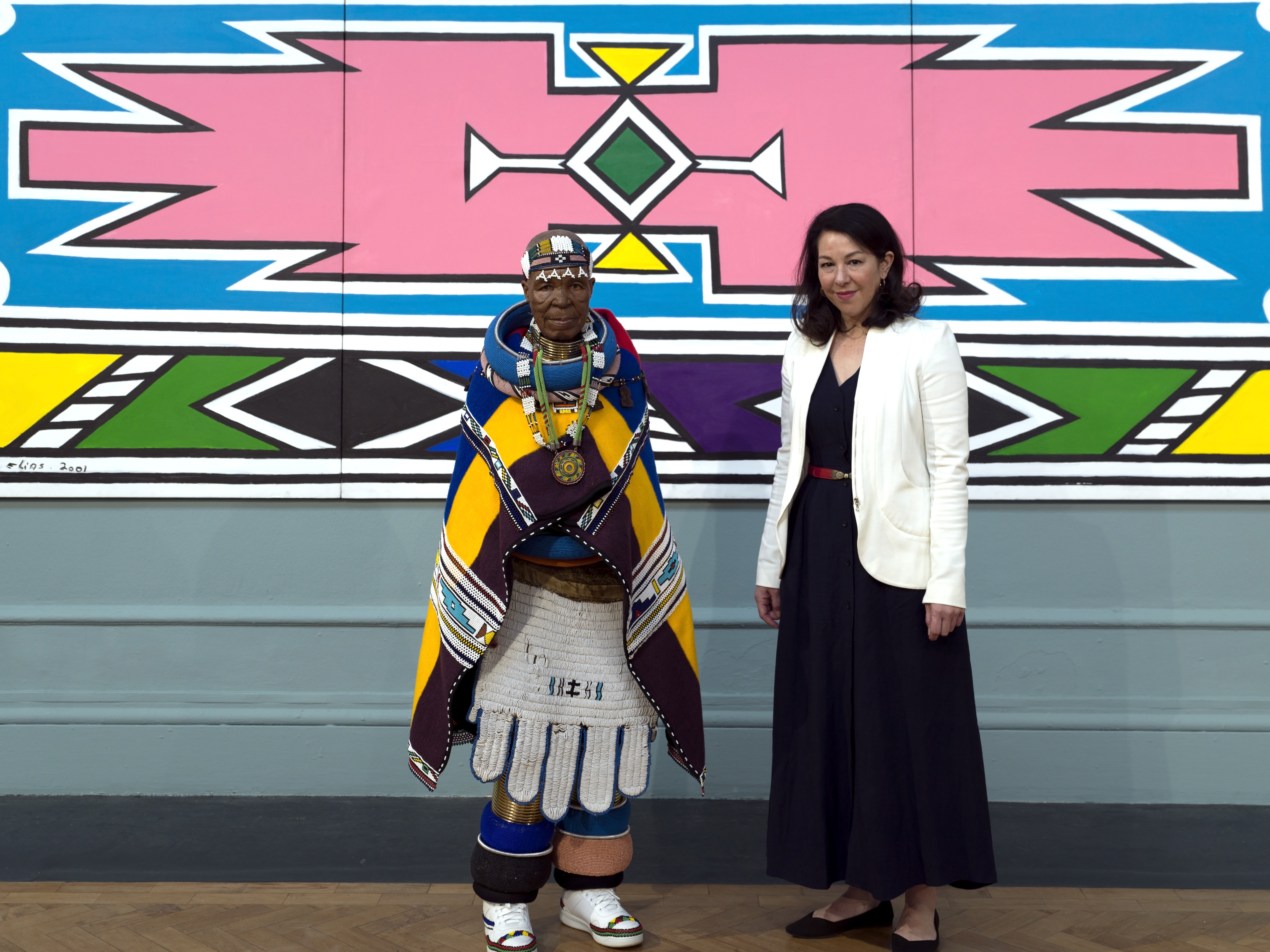 Esther Mahlangu and BMW Group engineer Stella Clarke meet at the opening of Esther Mahlangu's first retrospective in Cape Town. Photo: Clint Strydom (02/2024)