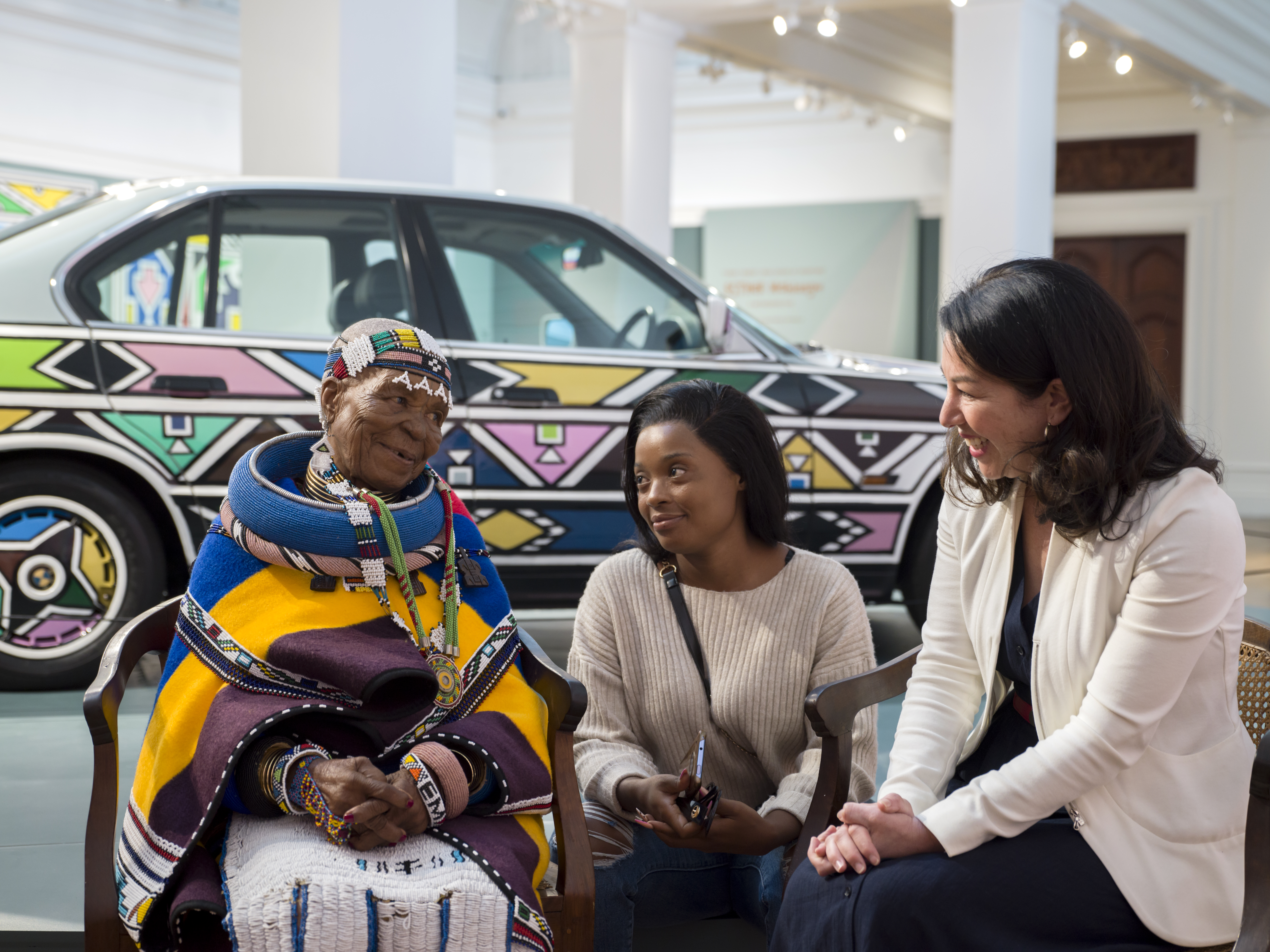 Esther Mahlangu and BMW Group engineer Stella Clarke meet at the opening of Esther Mahlangu's first retrospective in Cape Town. Photo: Clint Strydom (02/2024)