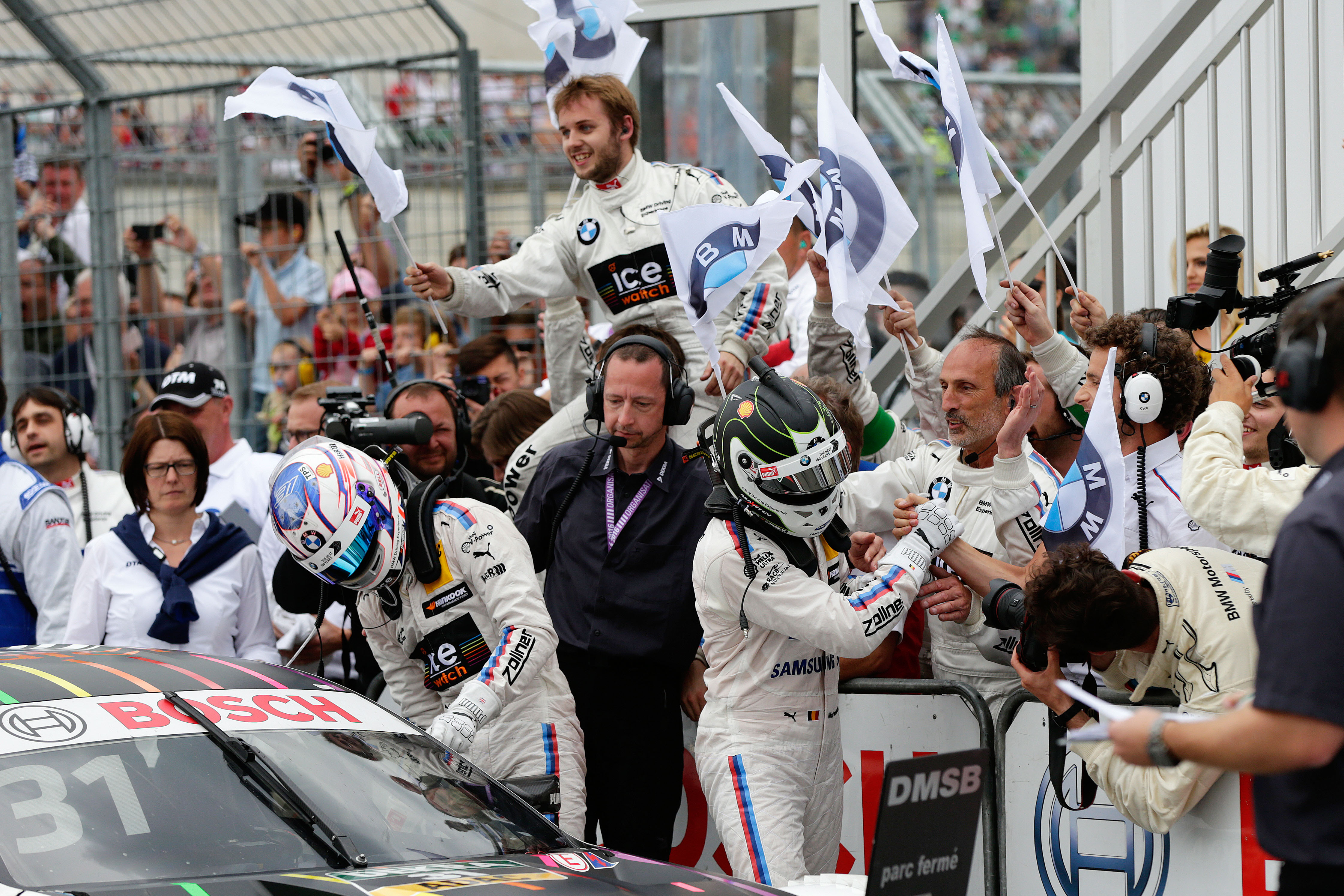 Norisring (DE) 26th June 2016. BMW Motorsport, Race 08, 2nd Place Driver Tom Blomqvist (GB) Ice-Watch BMW M4 DTM and 3rd Place Driver Maxime Martin (BE) SAMSUNG BMW M4 DTM.