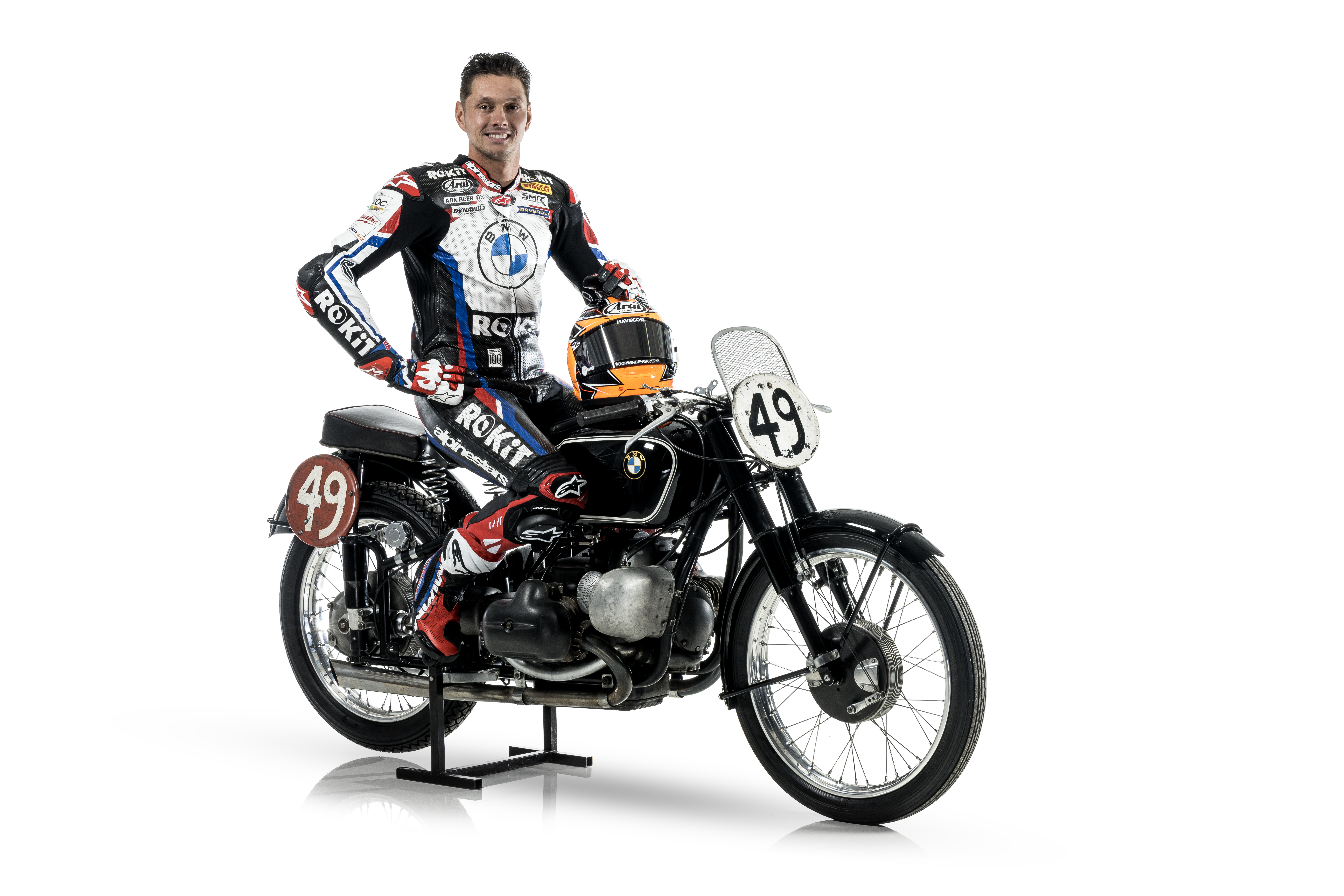 Munich (GER), 17th February 2023. BMW Motorrad Motorsport, 2023 FIM Superbike World Championship, 100 Years of BMW Motorrad, Michael van der Mark (NED), ROKiT BMW Motorrad WorldSBK Team, Historic bike: BMW R 255 Kompressor (1939).