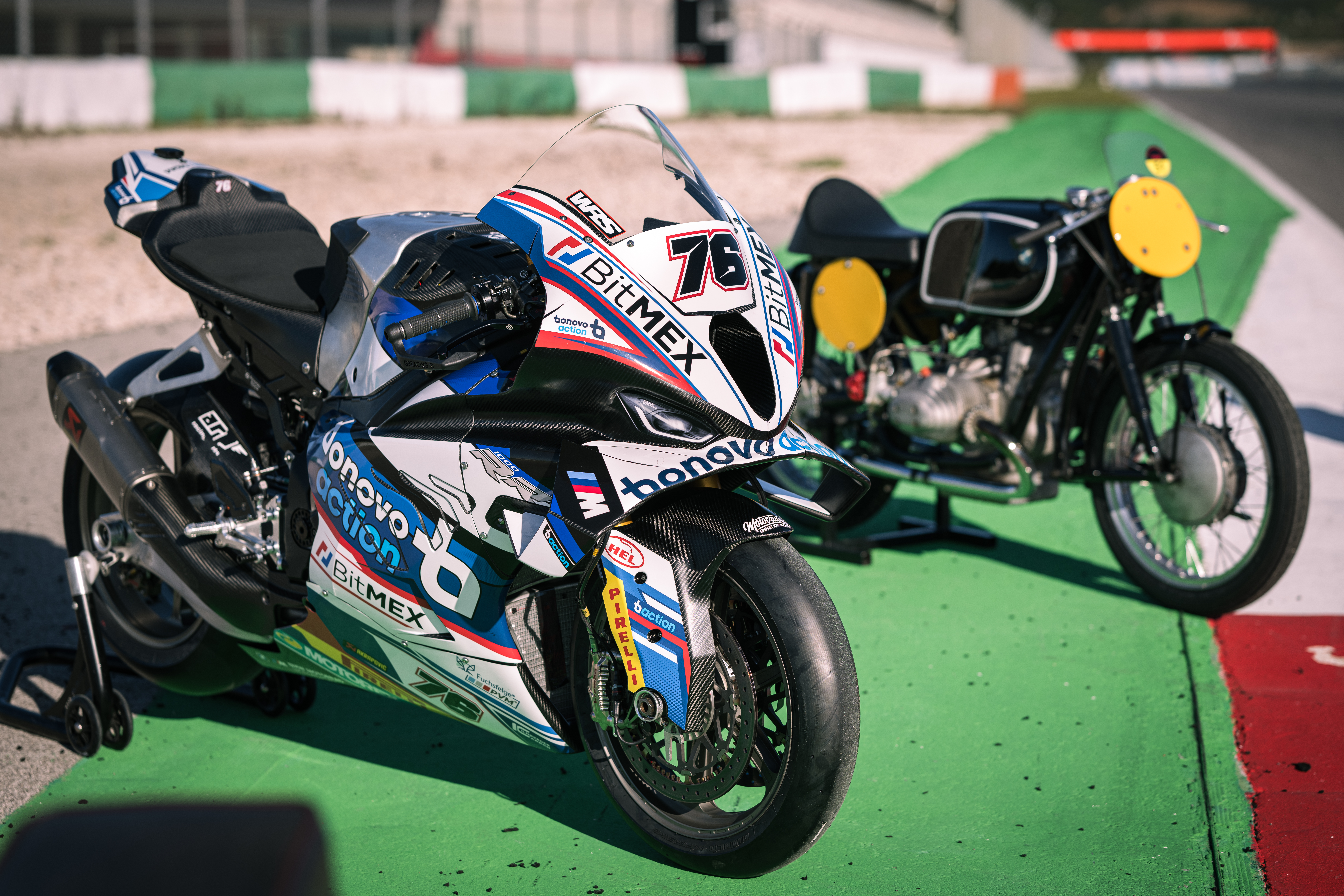 Munich (GER), 17th February 2023. BMW Motorrad Motorsport, 2023 FIM Superbike World Championship, 100 Years of BMW Motorrad, Bonovo action BMW Racing Team, #76 BMW M 1000 RR, Loris Baz (FRA). Historic bike: BMW RS 54 (1954).