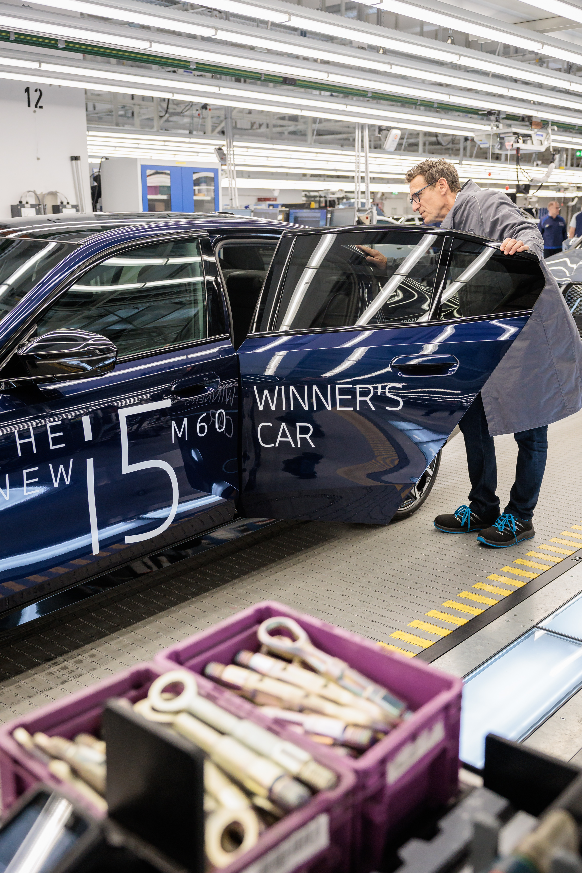 BMW Open Tournament Director Patrik Kühnen at BMW Group Plant Dingolfing with the 2024 Winner's Car, the BMW i5 M60.