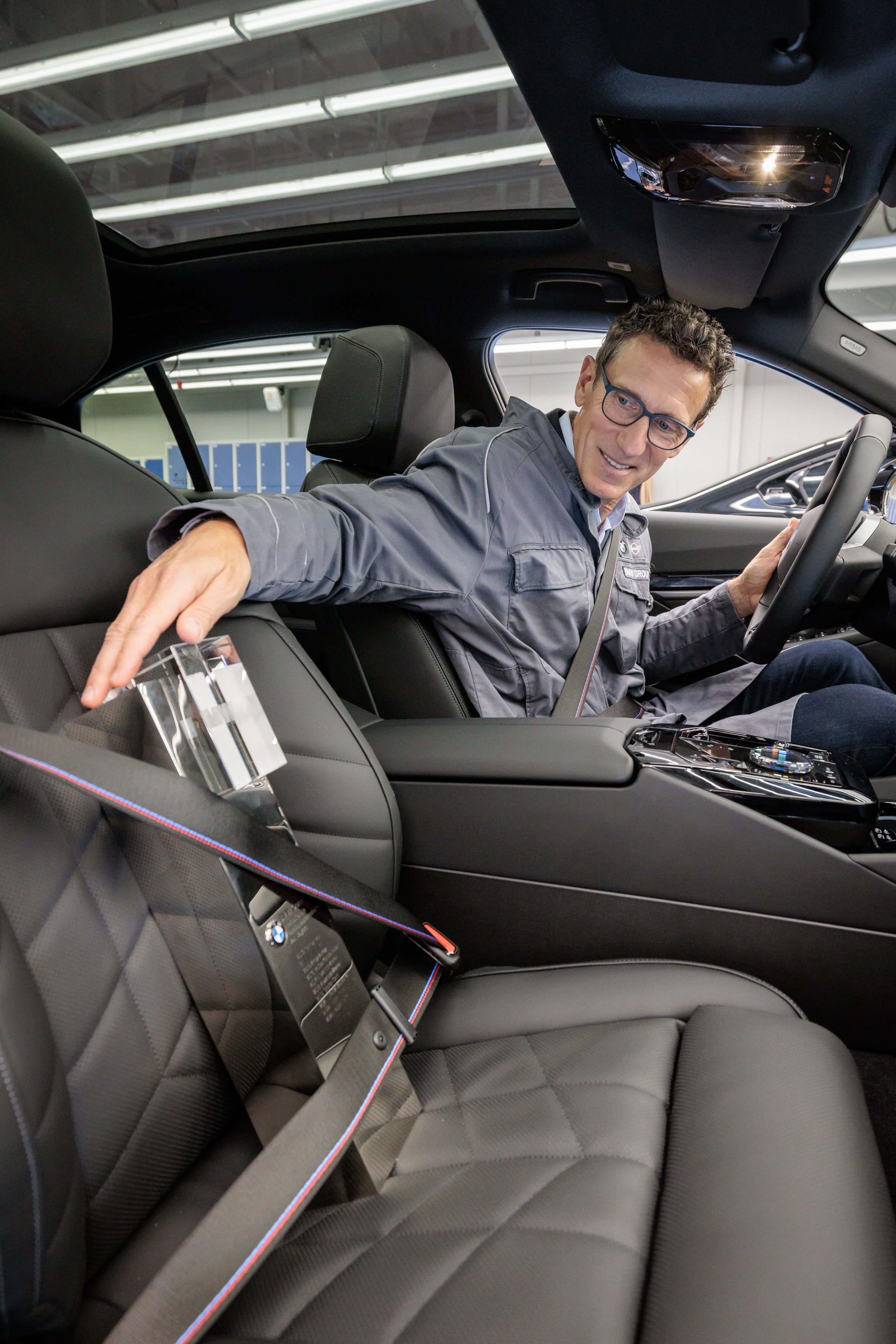 BMW Open Tournament Director Patrik Kühnen at BMW Group Plant Dingolfing with the 2024 Winner's Car, the BMW i5 M60.