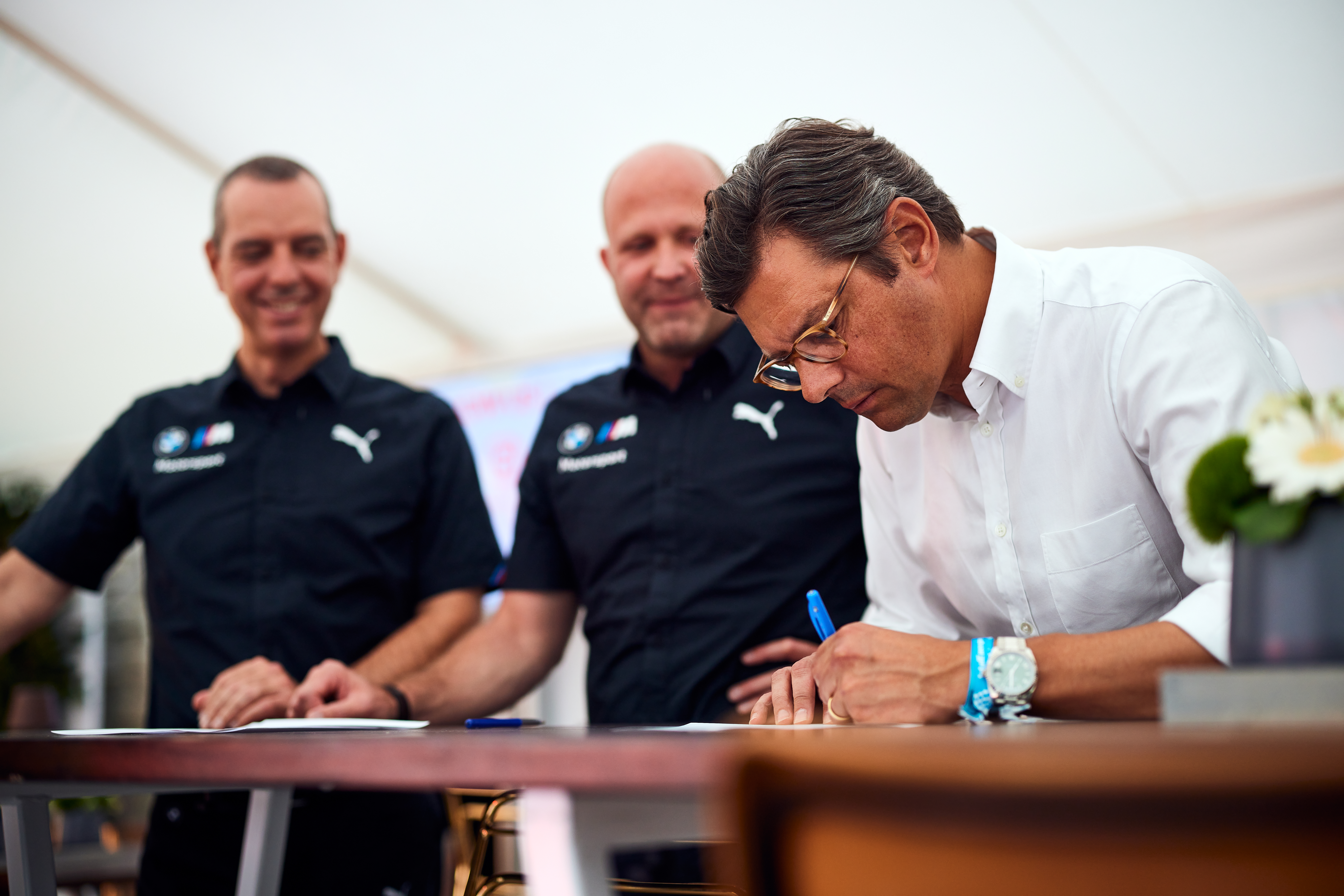 Munich (GER), 2nd August 2022. Team WRT, BMW M Motorsport, FIA World Endurance Championship, BMW M Hybrid V8, LMDh, agreement, signing, Franciscus van Meel, CEO of BMW M GmbH, Andreas Roos, Head of BMW M Motorsport, Pascal Weerts, CEO of Weerts Group