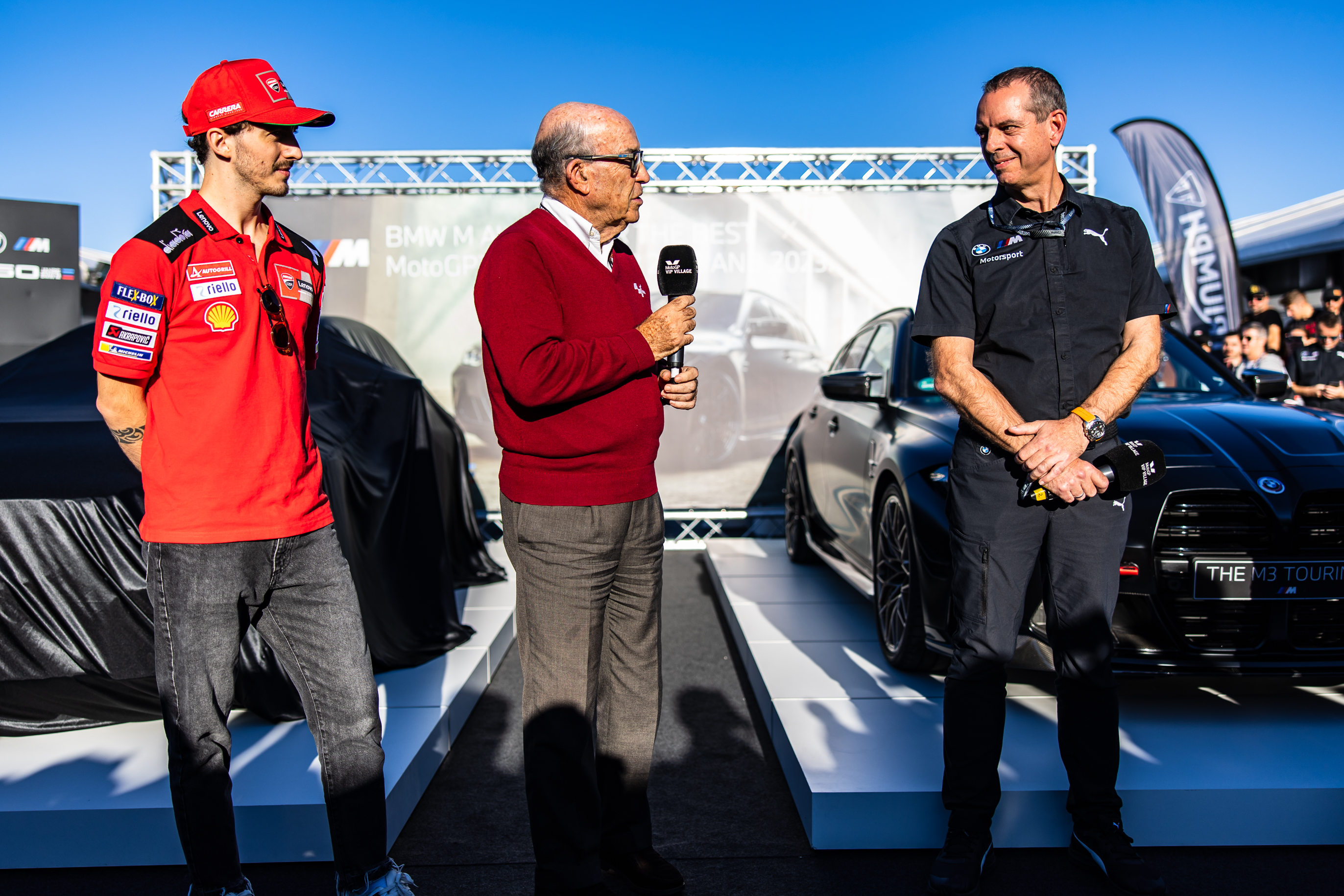 Valencia (ESP), 5th November 2022. BMW M GmbH, 2022 BMW M Award, MotoGP™. Carmelo Ezpeleta, CEO of Dorna Sports, winner Francesco Bagnaia (ITA), Franciscus van Meel, CEO of BMW M GmbH, winner's car BMW M3 Competition Touring with xDrive.