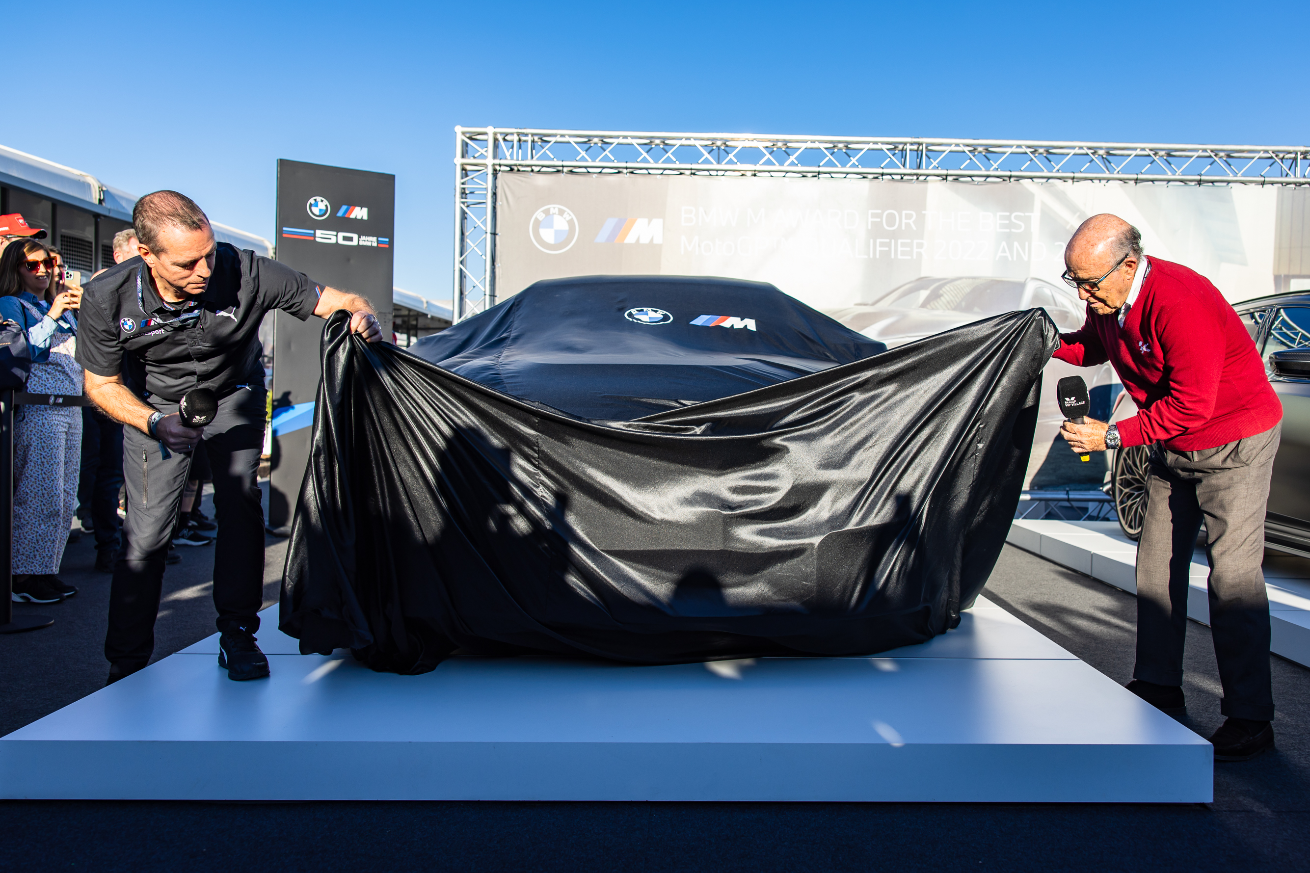 Valencia (ESP), 5th November 2022. BMW M GmbH, 2022 BMW M Award, MotoGP™. Franciscus van Meel, CEO of BMW M GmbH, Carmelo Ezpeleta, CEO of Dorna Sports, 2023 winner's car BMW M2.