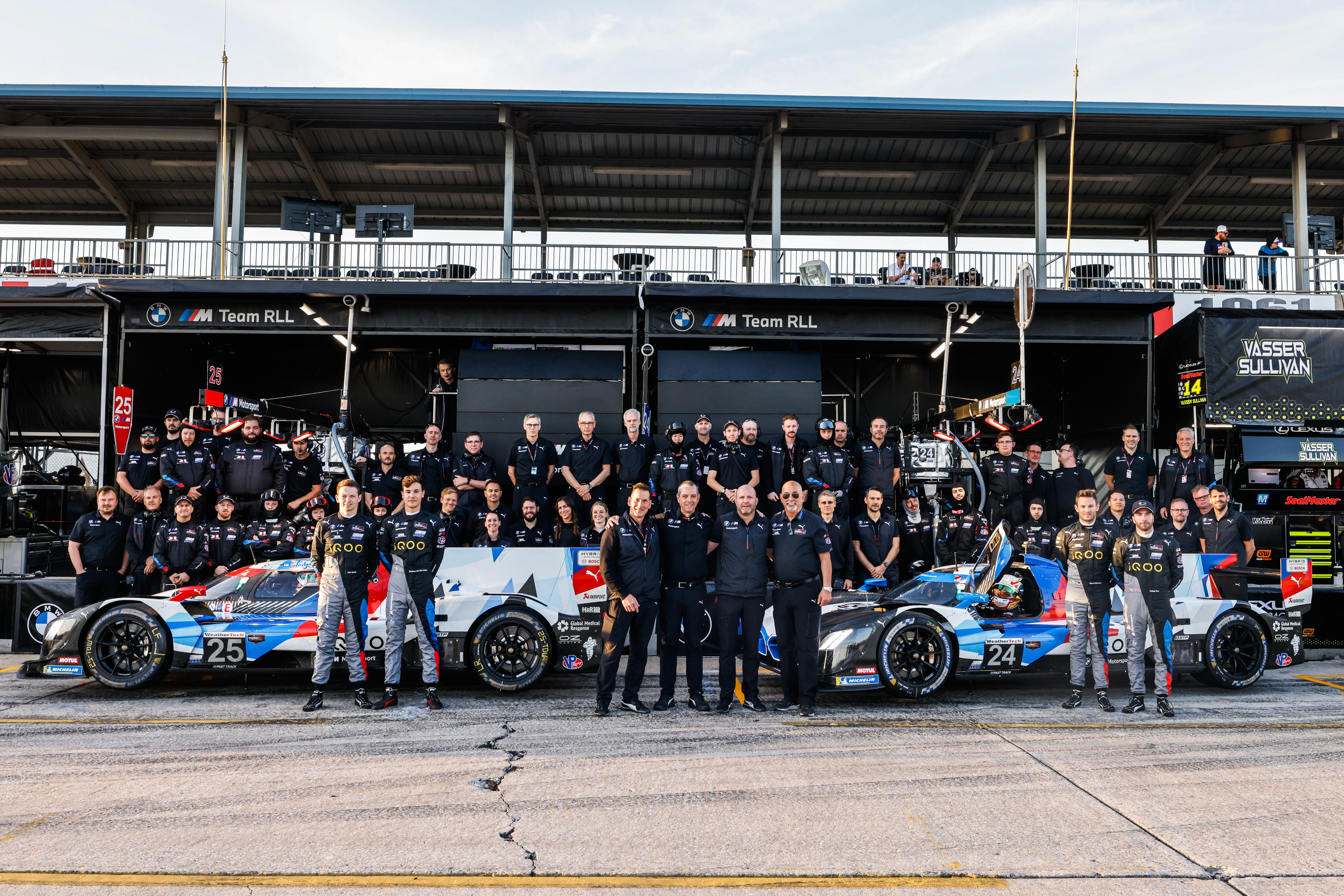 Sebring (USA), 15th to 18th March 2023. BMW M Motorsport, IMSA WeatherTech SportsCar Championship, Twelve Hours of Sebring, Franciscus van Meel, CEO of BMW M GmbH, BMW M Team RLL, #24 BMW M Hybrid V8, Philipp Eng (AUT), Augusto Farfus (BRA), Marco Wittmann (GER), #25 BMW M Hybrid V8, Connor De Phillippi (USA), Nick Yelloly (GBR), Sheldon van der Linde (RSA), GTP class.