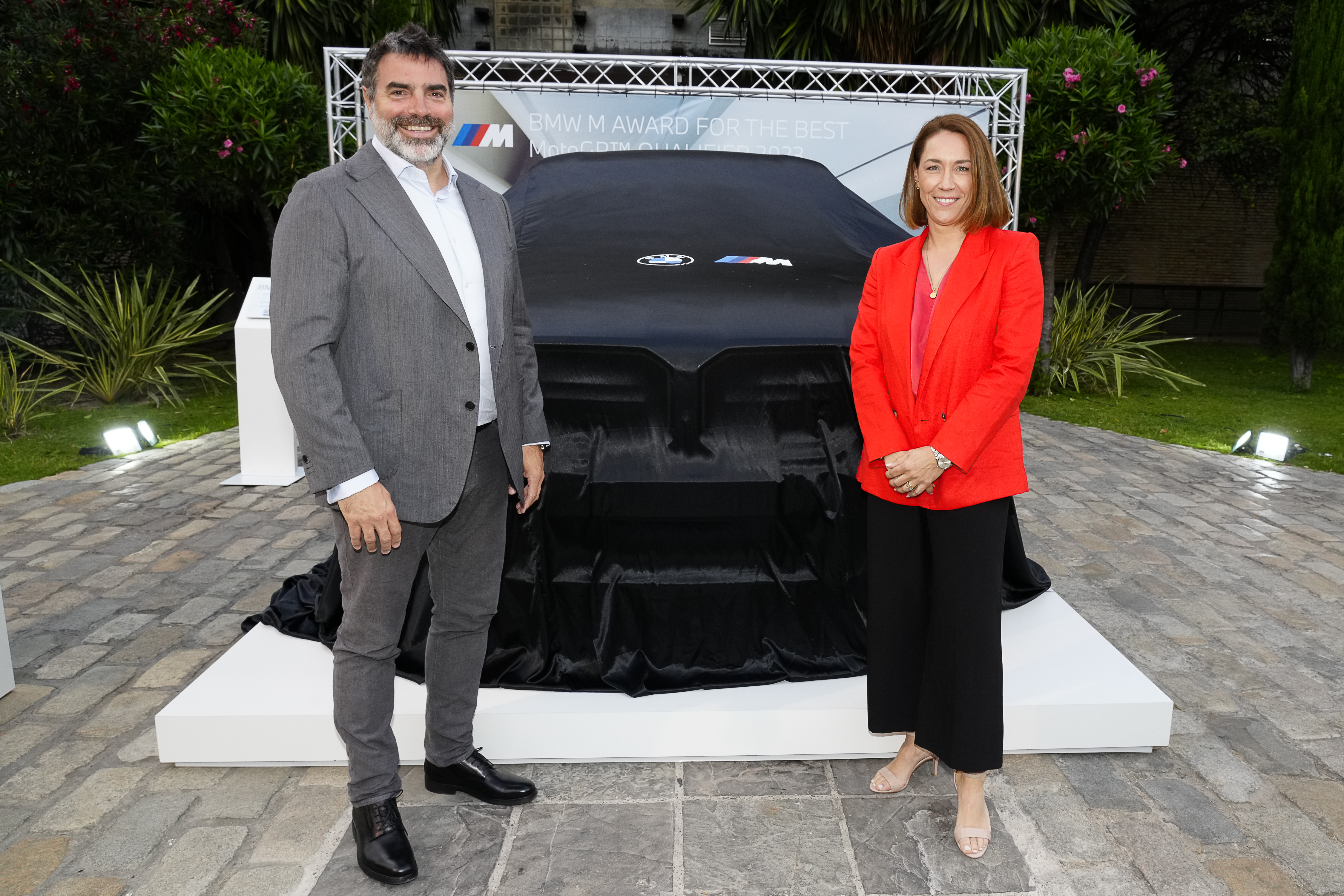 Jerez de la Frontera (ESP), 28th April 2023. BMW M GmbH, 2023 BMW M Award, MotoGP™. Marc Saurina, Head of Global Commercial Partnerships at Dorna Sports, Steffi Armbruster, Head of BMW M Brand Experience, 2023 winner's car BMW XM Label Red.