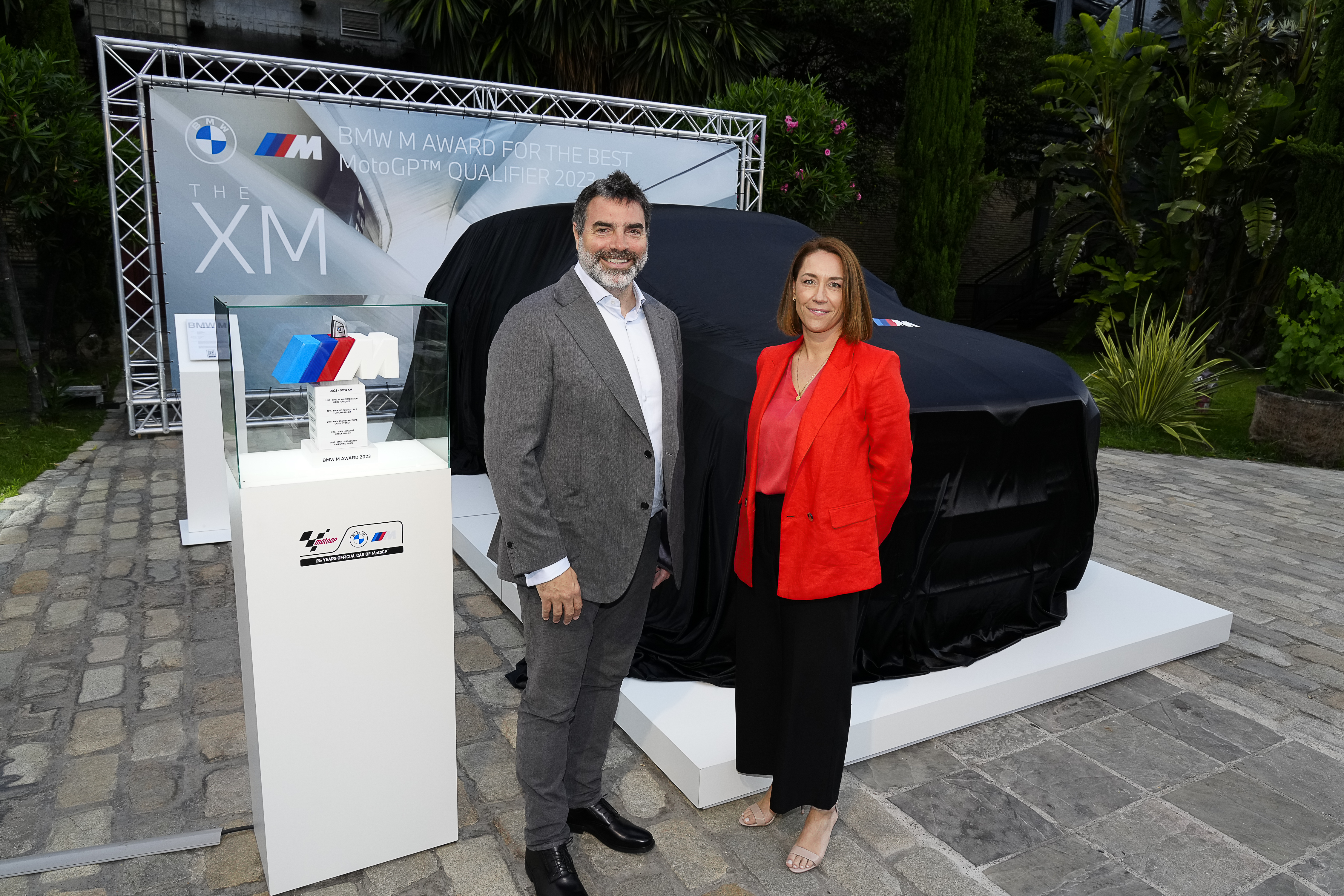 Jerez de la Frontera (ESP), 28th April 2023. BMW M GmbH, 2023 BMW M Award, MotoGP™. Marc Saurina, Head of Global Commercial Partnerships at Dorna Sports, Steffi Armbruster, Head of BMW M Brand Experience, 2023 winner's car BMW XM Label Red.