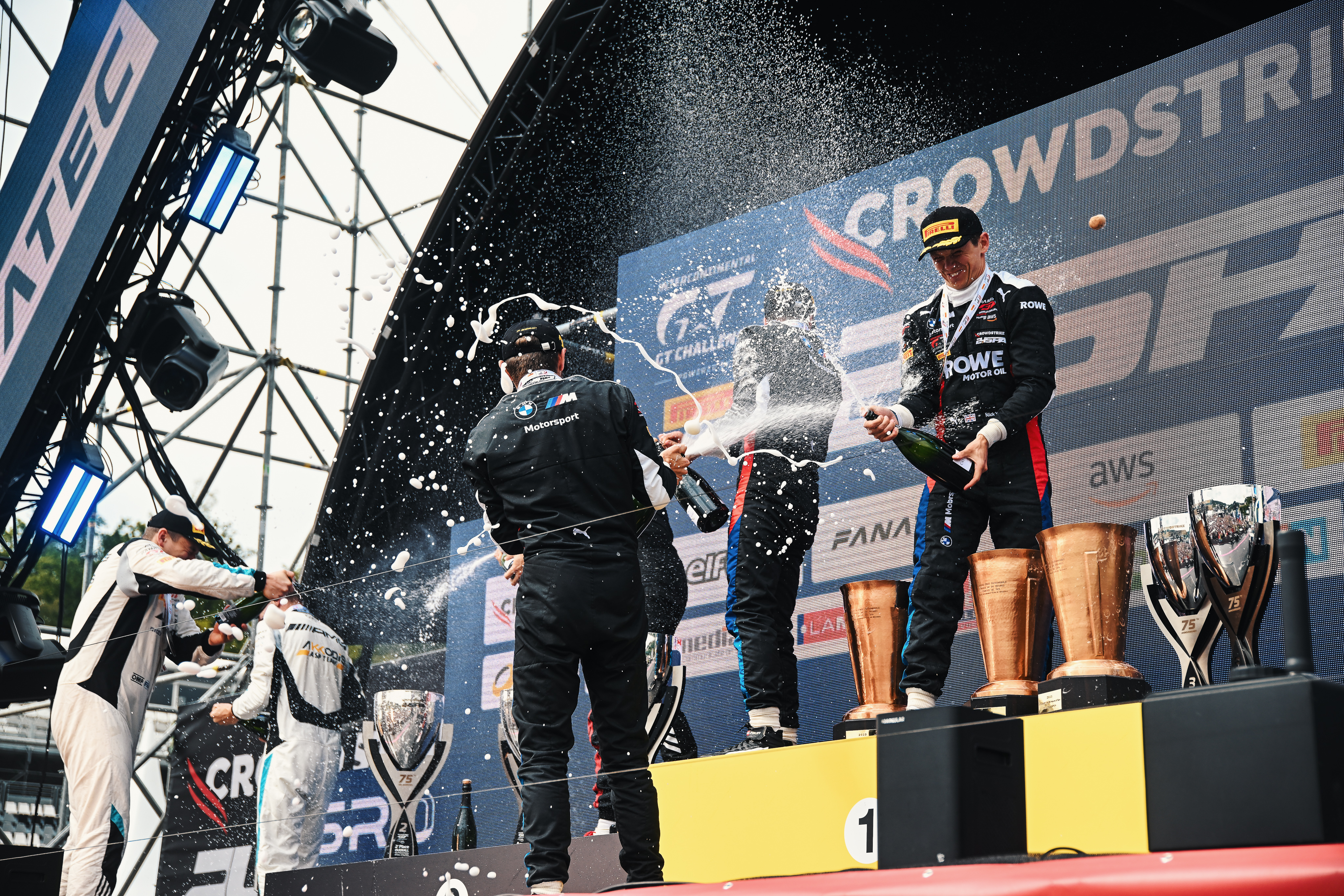 Spa-Francorchamps (FRA), 29th June to 2nd July 2023. BMW M Motorsport, FANATEC GT World Challenge Europe powered by AWS, Endurance Cup, Intercontinental GT Challenge, 24 Hours of Spa-Francorchamps. ROWE Racing, #98 BMW M4 GT3, Philipp Eng (AUT), Marco Wittmann (GER), Nick Yelloly (GBR), podium.