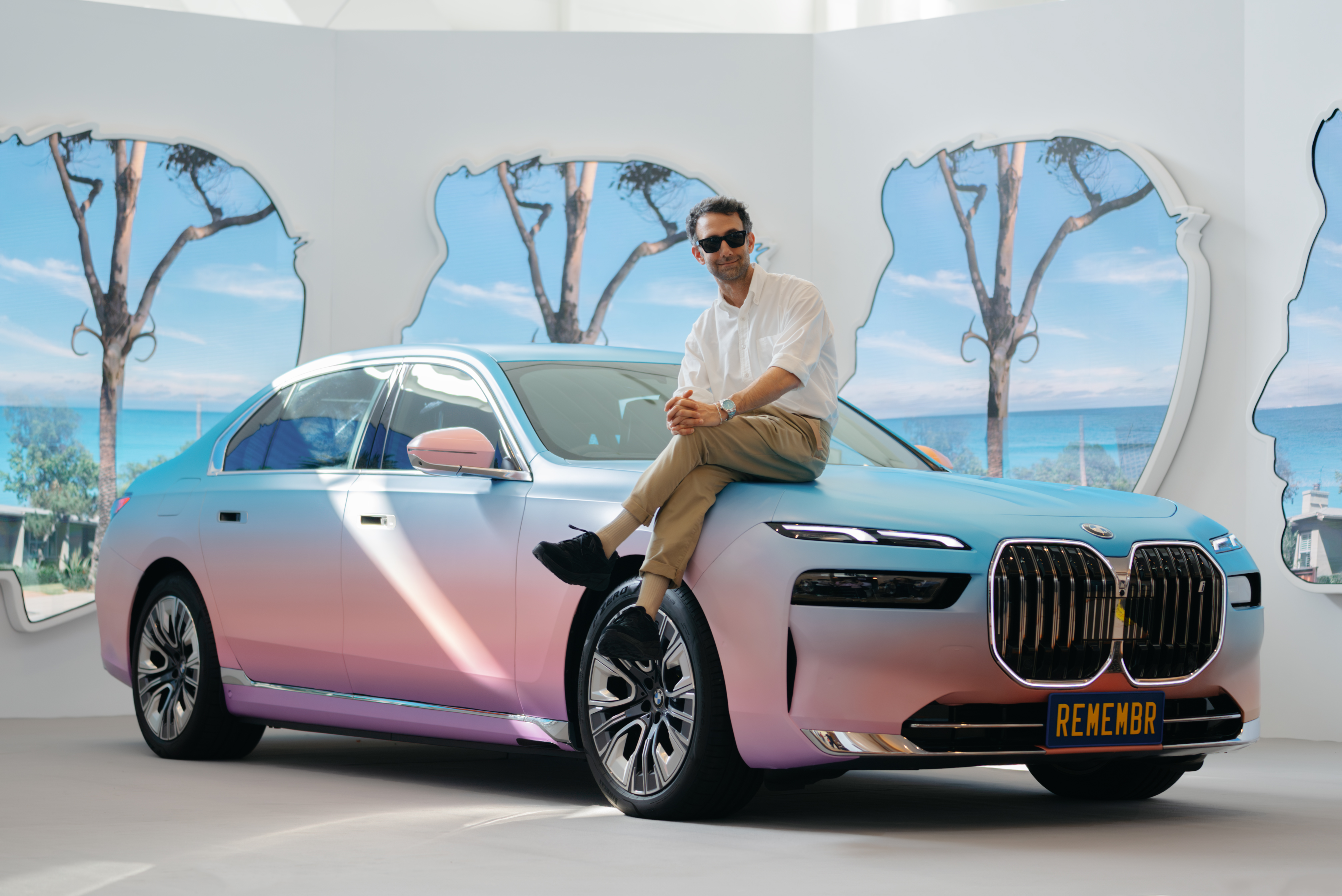Artist Alex Israel and his AI video installation REMEMBR, inspired by the all-electric BMW i7 at Art Basel in Hong Kong 2024. Photo: Lucy Emms (03/2024)