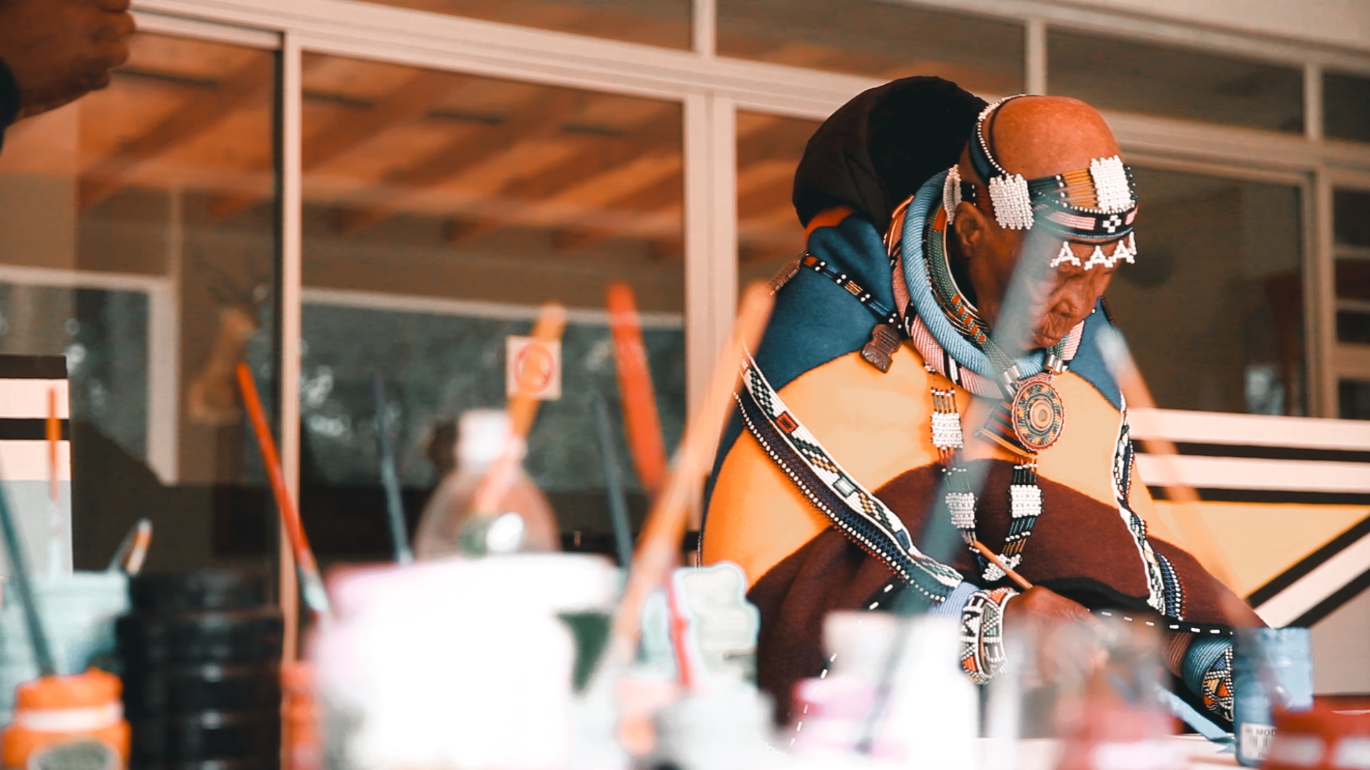 Artist Esther Mahlangu working on her mural ‘Umuntu ngumuntu ngabantu’ (‘I am because you are’) for Serpentine, London. Photo: Diliza Moabi. (09/2024)