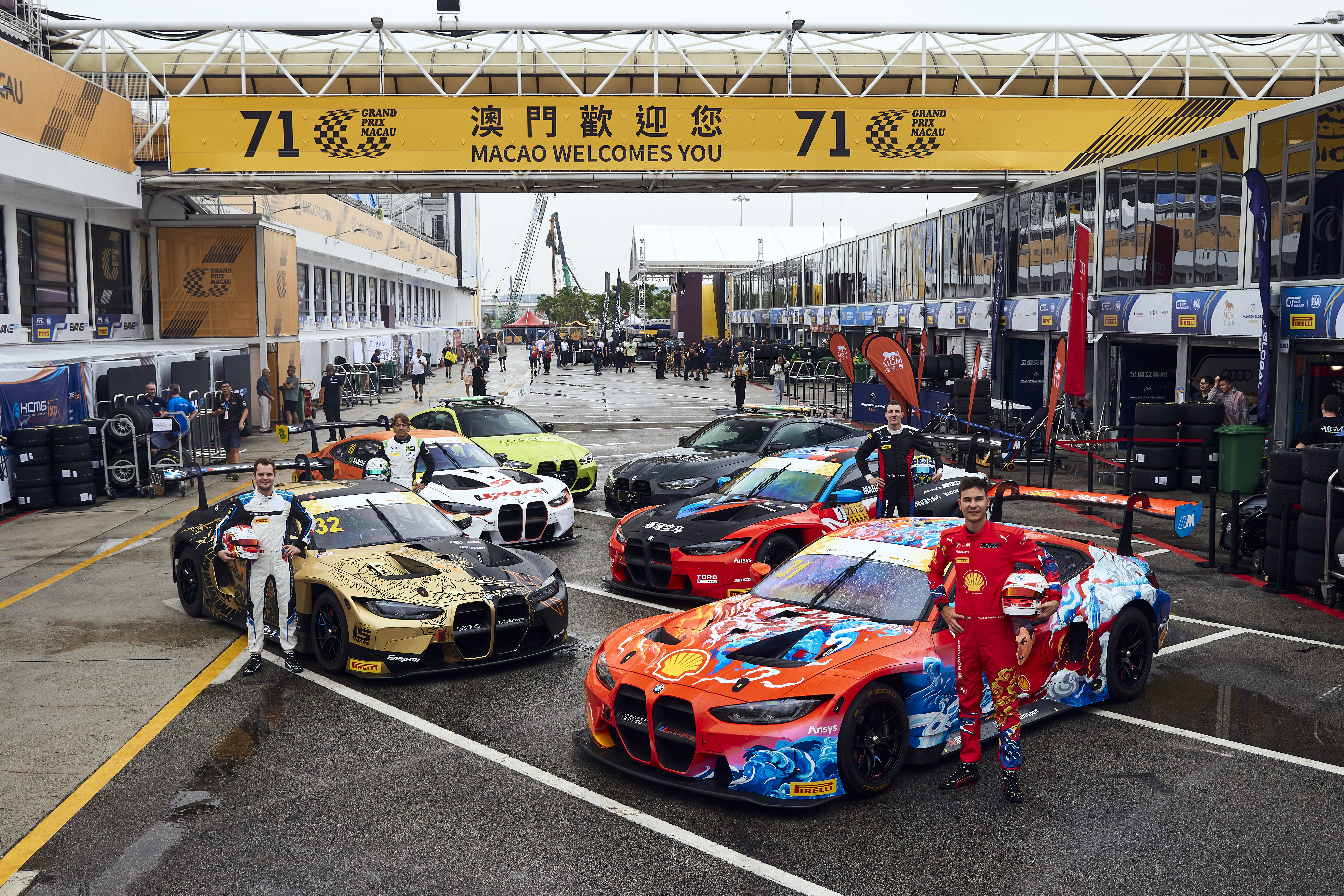 Macau (CHN), 13-17 November 2024. FIA GT World Cup, Guia Circuit, BMW M4 GT3, Sheldon van der Linde, Dries Vanthoor, Raffaele Marciello, Augusto Farfus, BMW M Safety Cars.