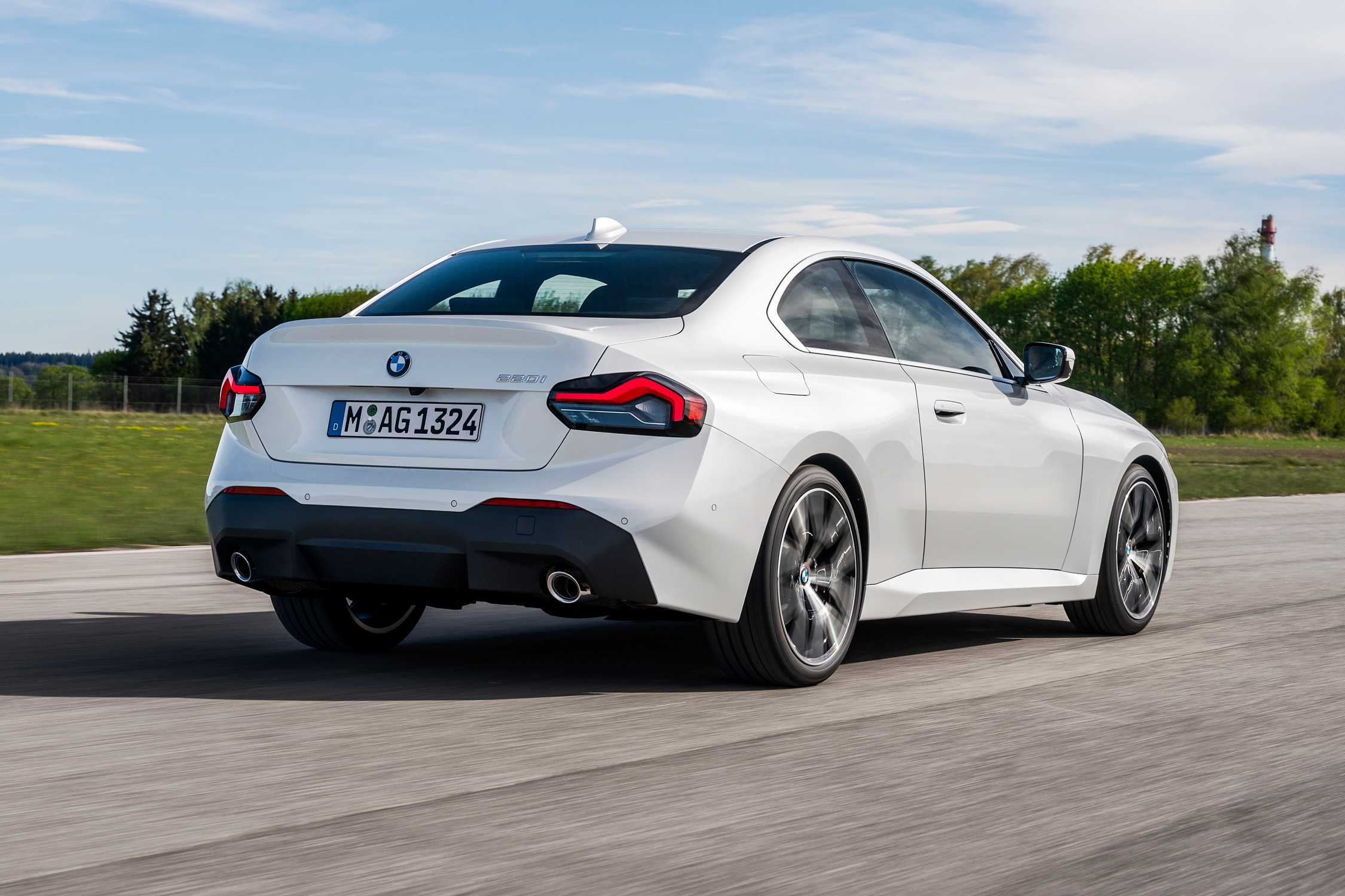 The all-new BMW 220i Coupé, Mineral White Metallic, 19" Wheel Styling 783 Bicolor (07/2021).