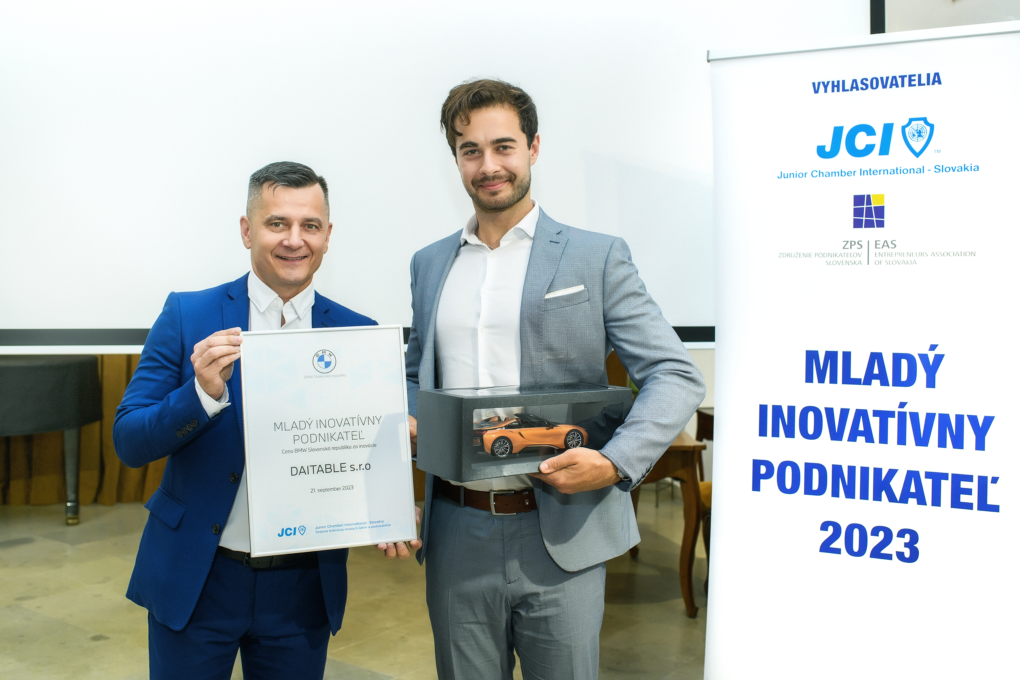 Announcement of the JCI and Young Innovative Entrepreneur Award 2023 and the BMW Slovak Republic Award for Innovation - Milan Stupka from BMW Slovenská republika and Šimon Staňo from DAITABLE. (09/2023)
