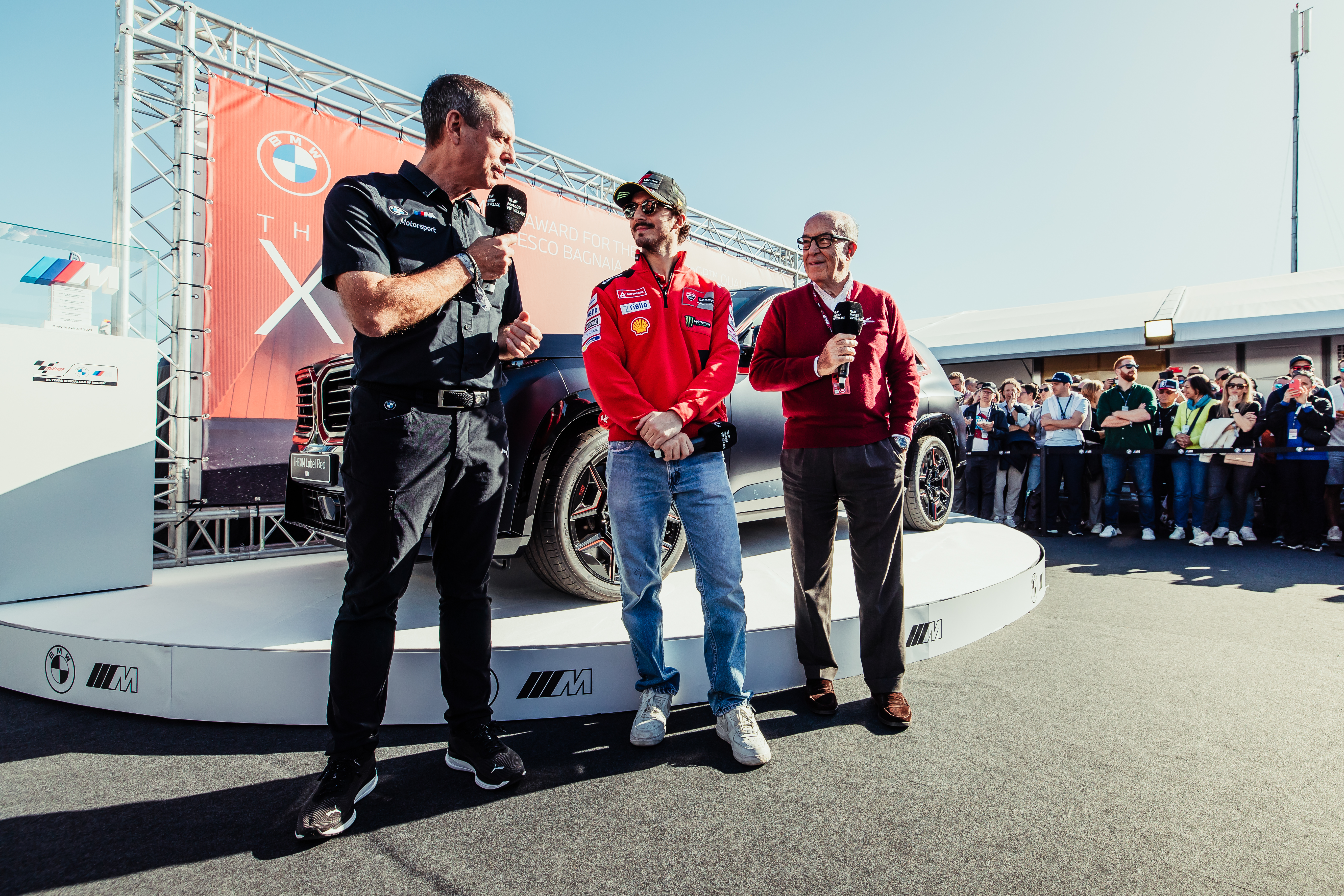 Valencia (ESP), 25th November 2023. BMW M GmbH, 2023 BMW M Award, MotoGP™. Franciscus van Meel, CEO of BMW M GmbH, winner Francesco Bagnaia (ITA), Carmelo Ezpeleta, CEO of Dorna Sports, winner's car BMW XM Label Red.