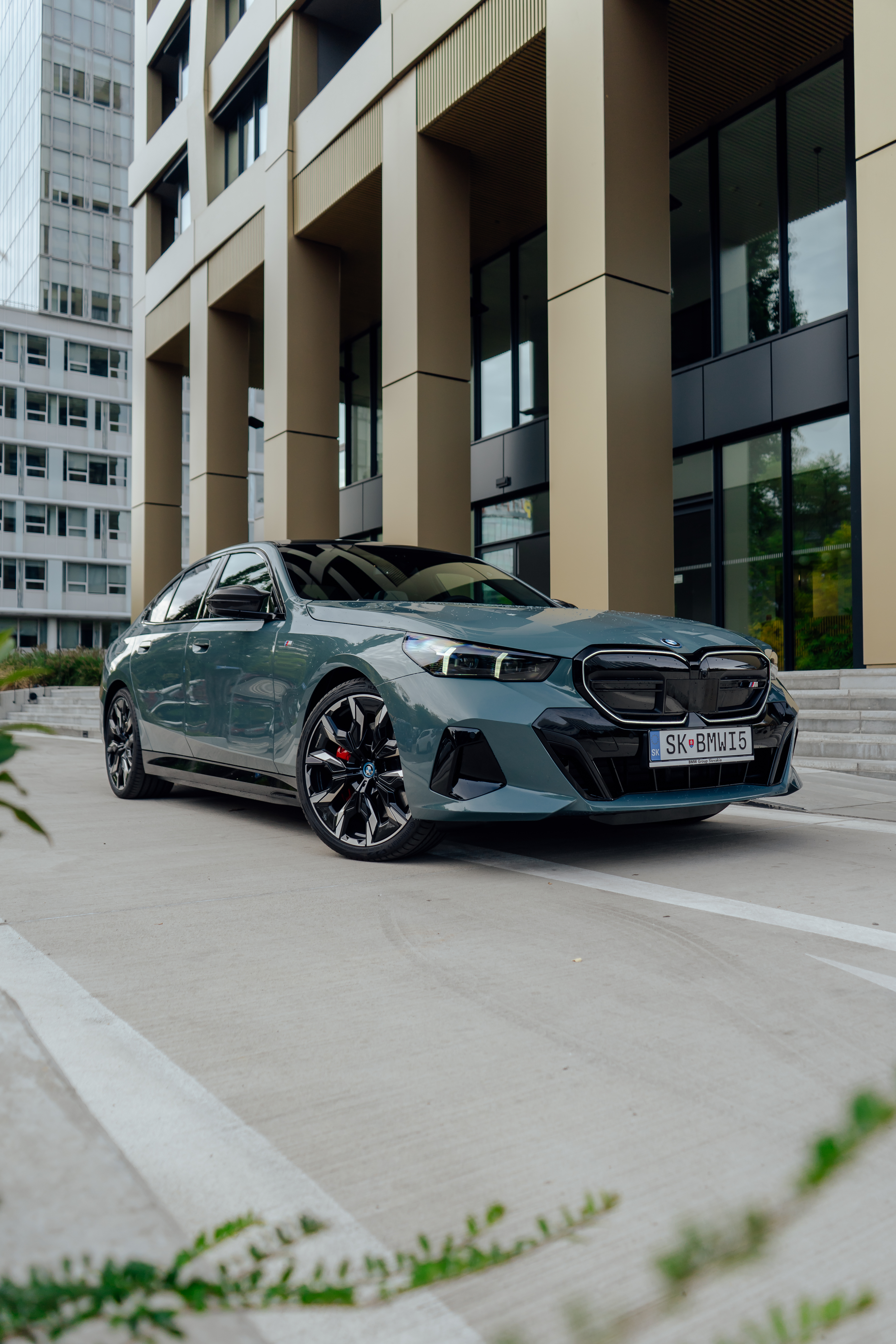 New BMW i5 M60 xDrive – Cape York Green Metallic/ BMW Individual 'Merino' Silverstone II/Atlas Grey – Location in Bratislava, Slovakia (12/2023)