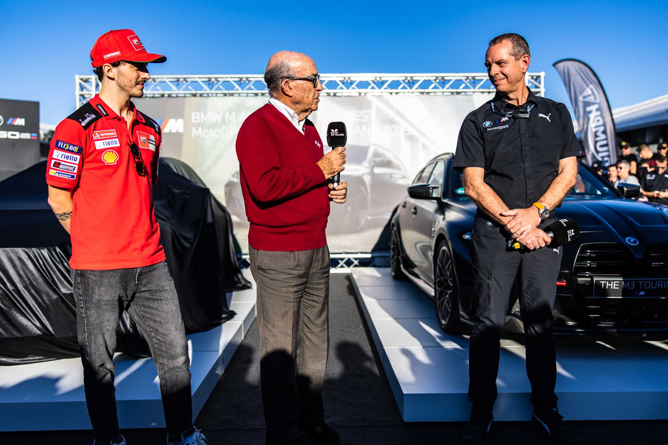 Valencia (ESP), 5th November 2022. BMW M GmbH, 2022 BMW M Award, MotoGP™. Carmelo Ezpeleta, CEO of Dorna Sports, winner Francesco Bagnaia (ITA), Franciscus van Meel, CEO of BMW M GmbH, winner's car BMW M3 Competition Touring with xDrive.