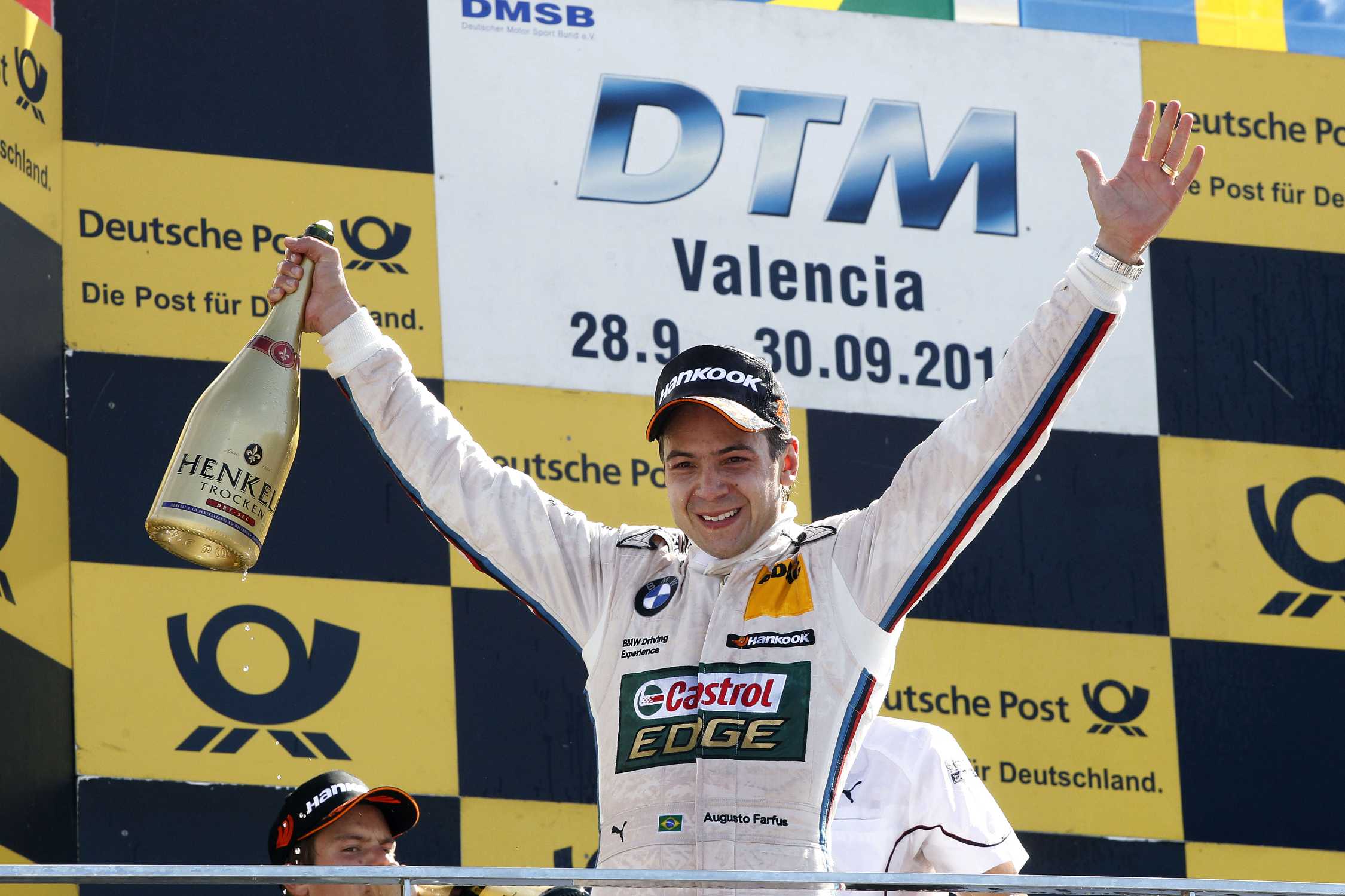 Augusto Farfus, del BMW Team RBM, ha ganado su primera carrera del DTM en el “Circuit de la Comunitat”. El piloto de 29 años, al volante del Castrol EDGE BMW M3 DTM, cruzó la línea de llegada 8,406 segundos por delante de Adrien Tambay (Francia, Audi) para convertirse en el primer brasileño en la historia del DTM en ocupar lo más alto del podio. Anteriormente, el piloto había ocupado su primera posición en la pole en la serie del sábado.