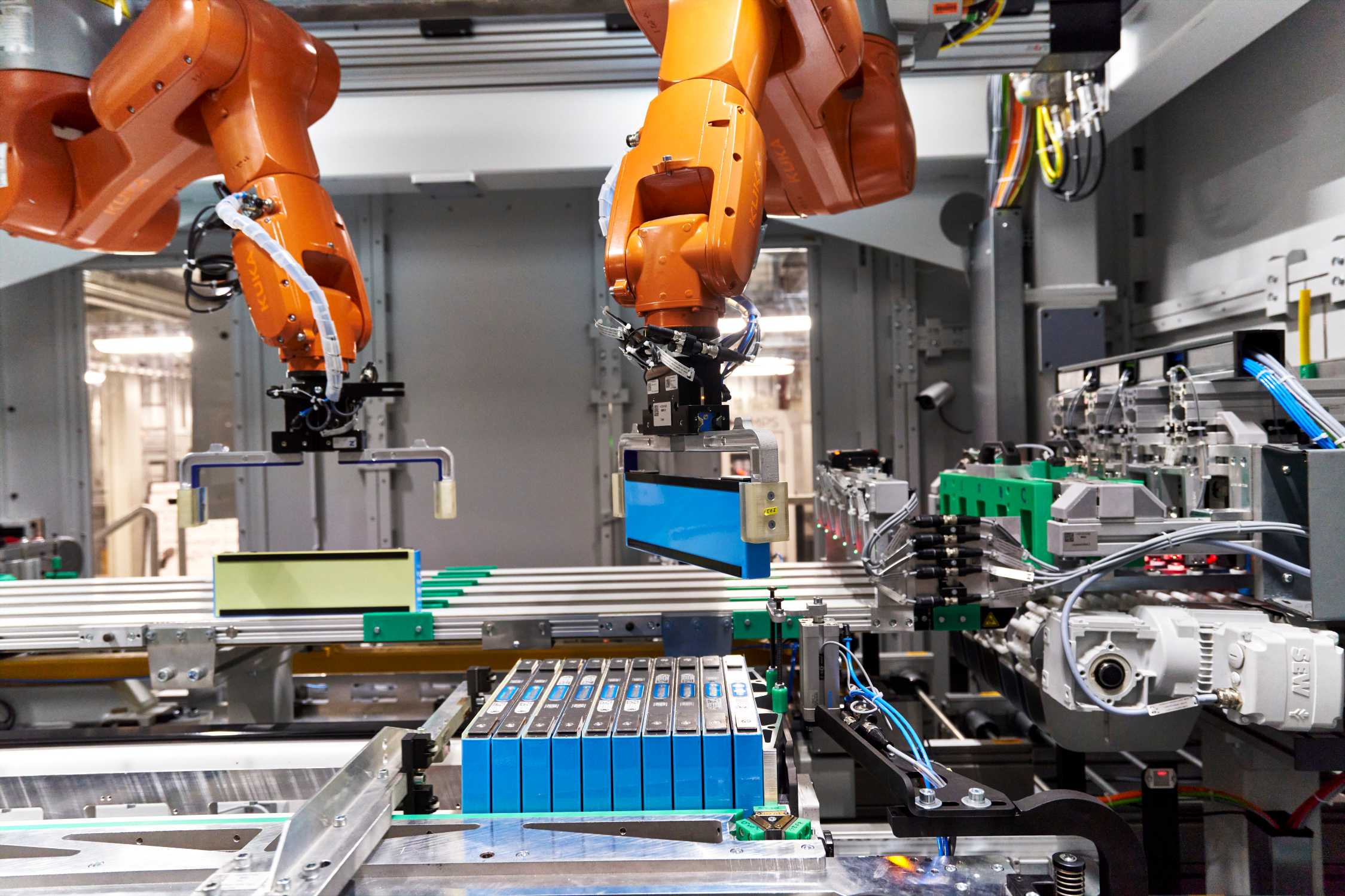 Cells are arranged into stacks in battery module production at BMW Group Plant Leipzig (11/2021).
