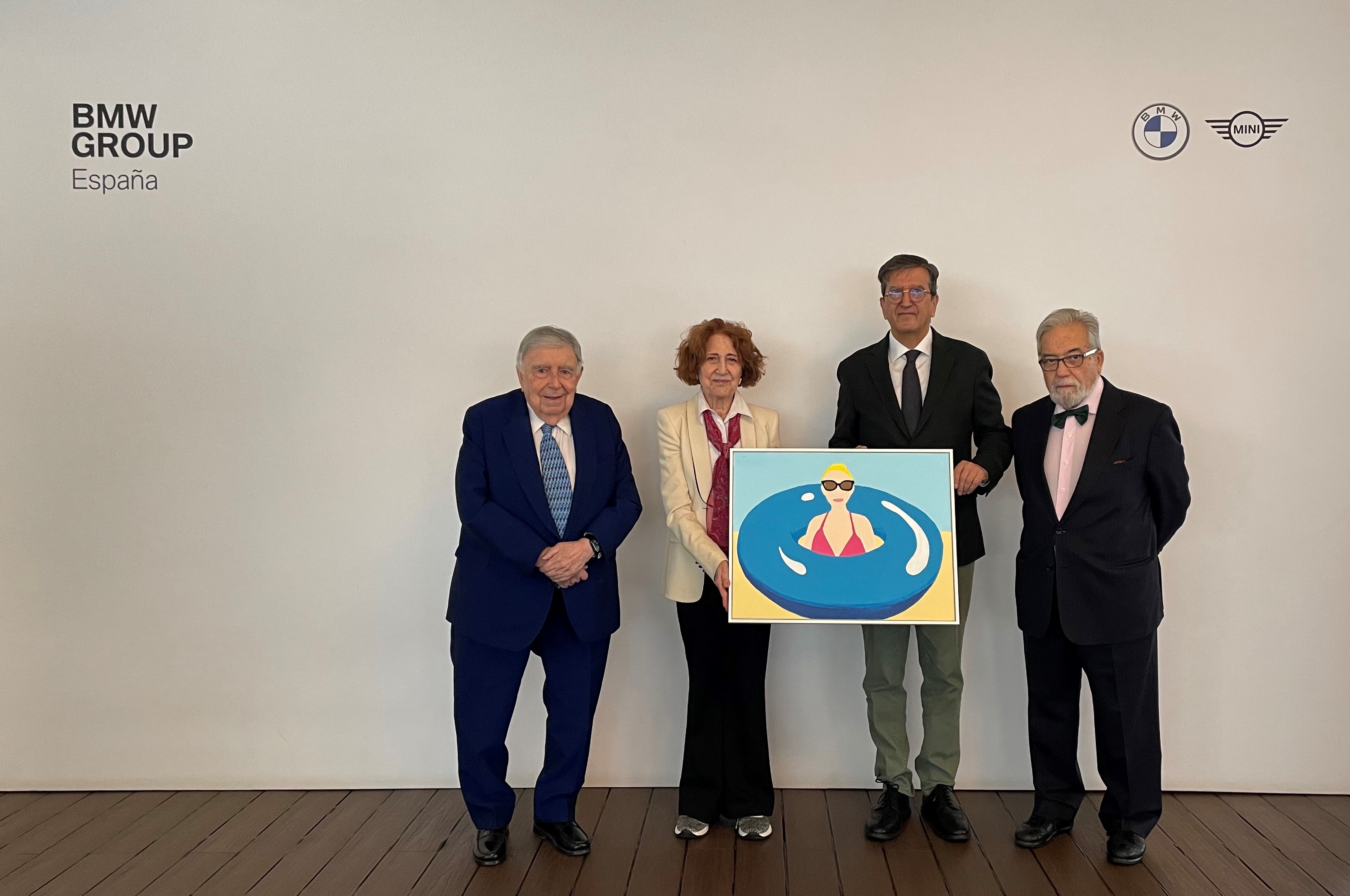 El jurado del Premio BMW de Pintura compuesto por Luis María Ansón, Carmen Iglesias, Enrique de Ybarra y Tomás Paredes, con la obra ganadora al Talento Joven "Autorretarto con flotador" de Andrea Hernádez.