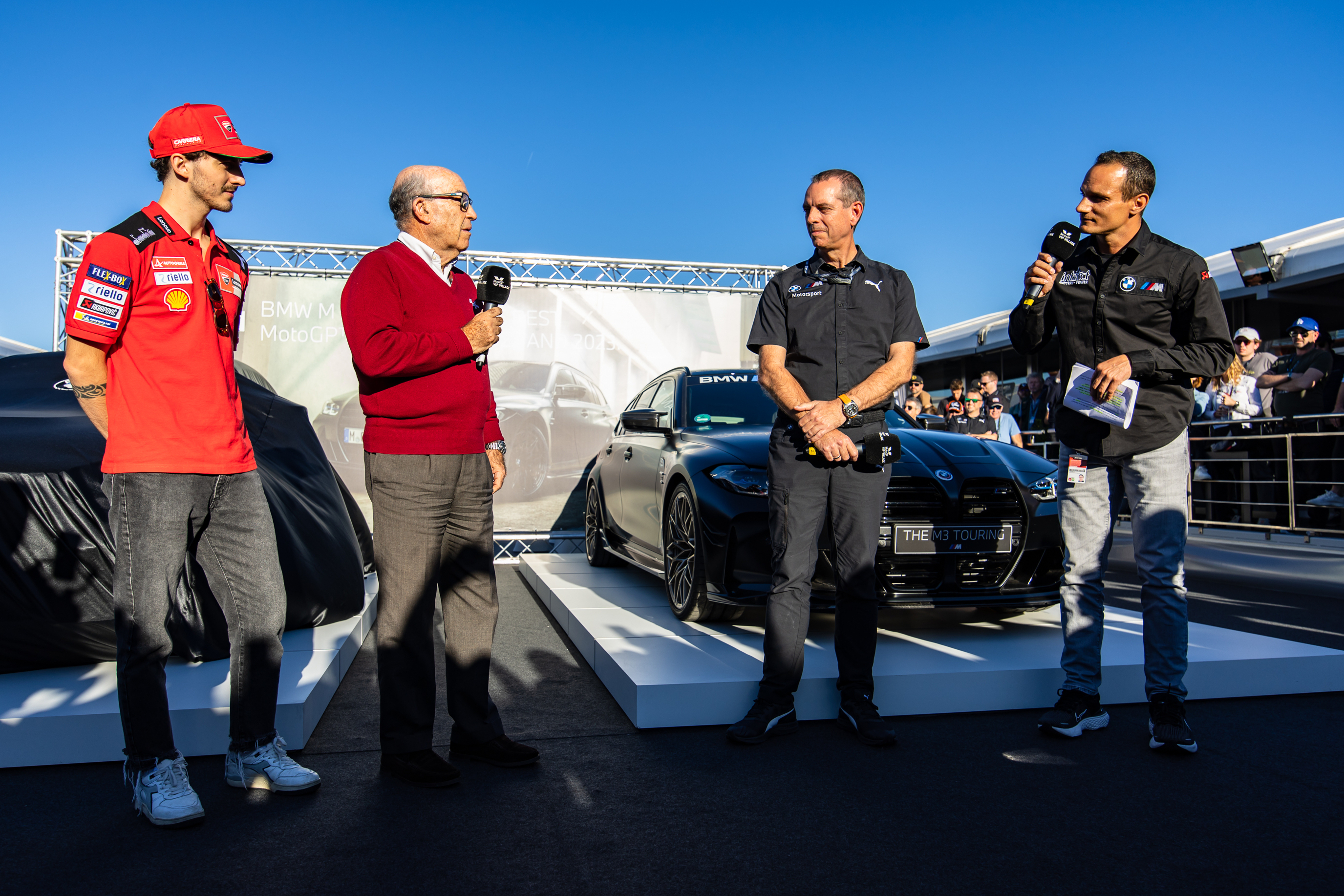 Valencia (ESP), 15th November 2025. BMW M GmbH, Official Car of MotoGP™, BMW M Award 2025, MotoGP™. Carmelo Ezpeleta, CEO of Dorna Sports, winner Marc Márquez (ESP), Axel Mittler, Marketing Manager at BMW M GmbH, winner's car BMW M2 CS.
