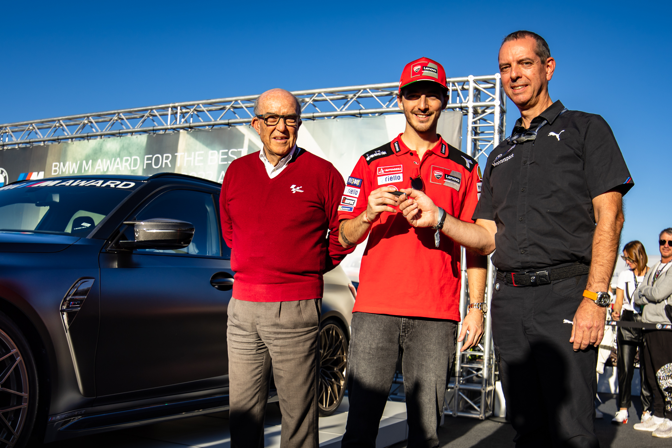 Valencia (ESP), 5th November 2022. BMW M GmbH, 2022 BMW M Award, MotoGP™. Carmelo Ezpeleta, CEO of Dorna Sports, winner Francesco Bagnaia (ITA), Franciscus van Meel, CEO of BMW M GmbH, winner's car BMW M3 Competition Touring with xDrive.