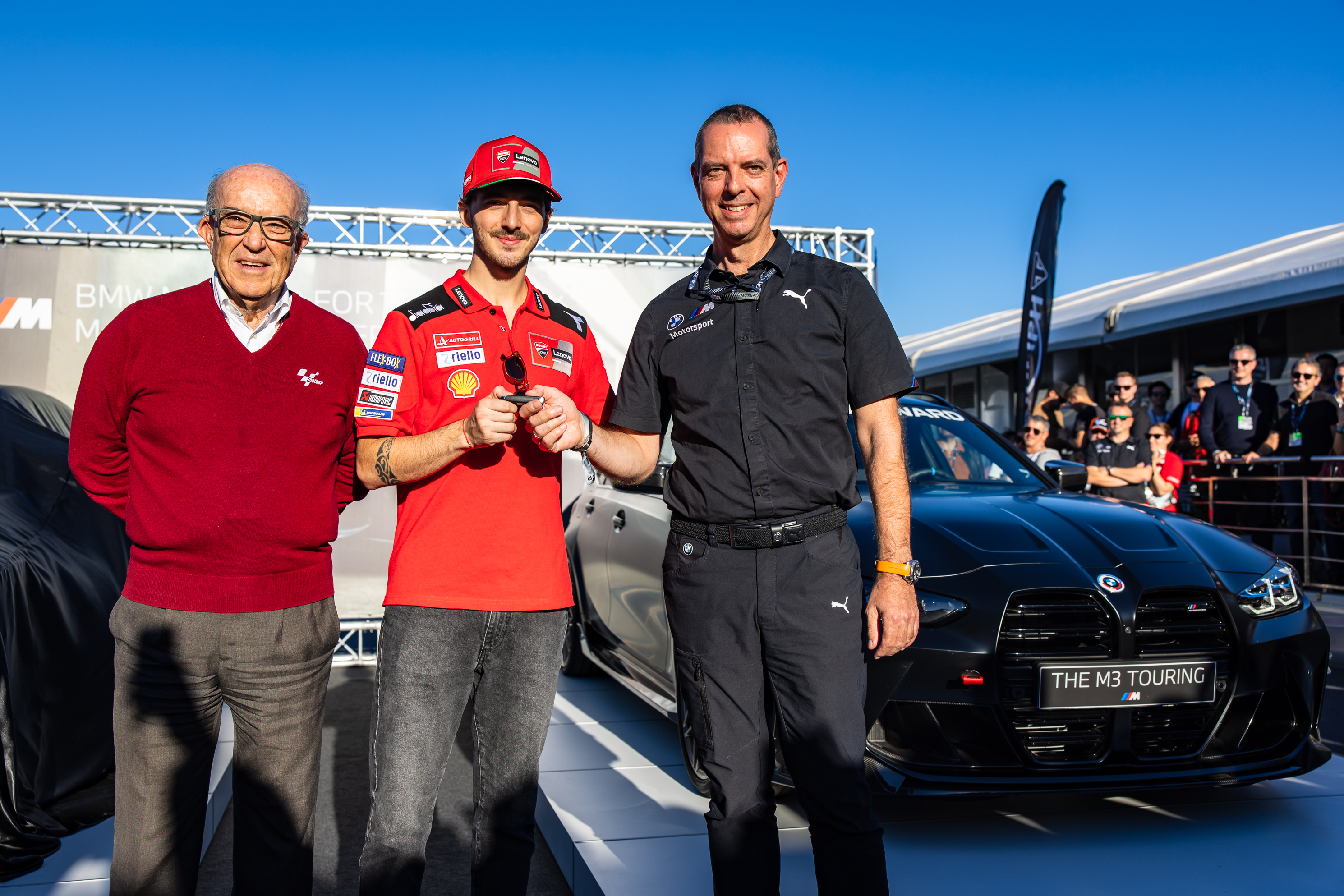 Valencia (ESP), 15th November 2025. BMW M GmbH, Official Car of MotoGP™, BMW M Award 2025, MotoGP™. Carmelo Ezpeleta, CEO of Dorna Sports, winner Marc Márquez (ESP), Axel Mittler, Marketing Manager at BMW M GmbH, winner's car BMW M2 CS.
