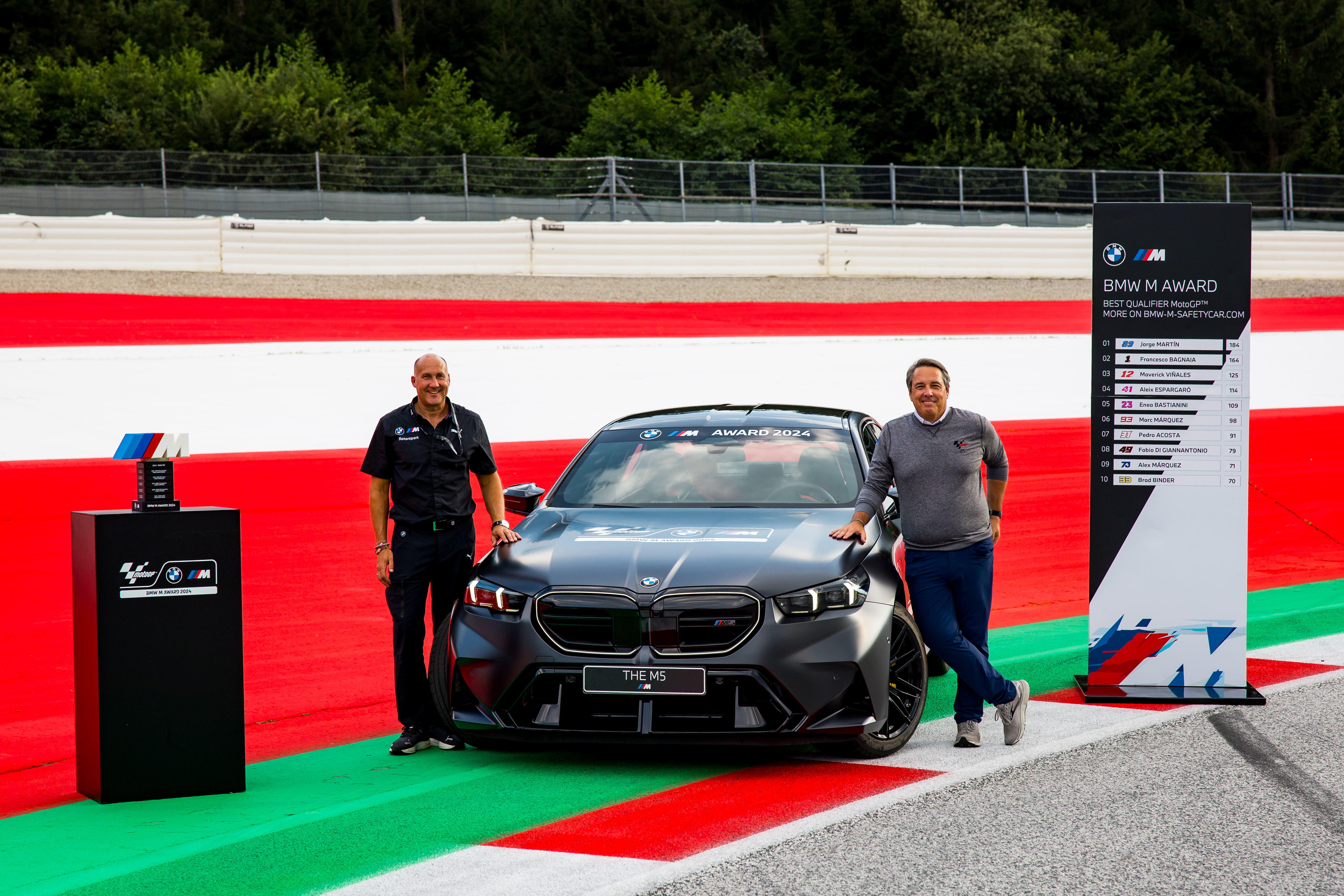 Spielberg (AUT), 15th August 2024. BMW M GmbH, 2024 BMW M Award, MotoGP™. Unveiling 2024 winner's car BMW M5, Axel Mittler, Marketing Manager MotoGP™ at BMW M GmbH, Dan Rossomondo, Chief Commercial Officer at MotoGP™ rights holder Dorna Sports.