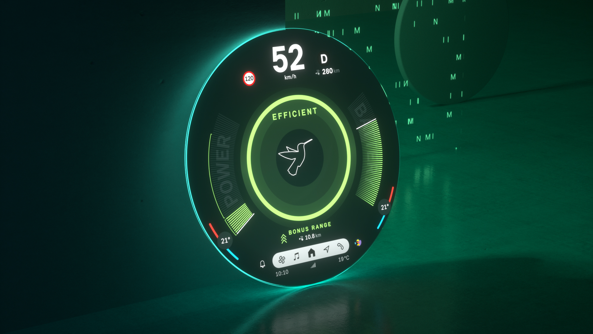 MINI Experience Mode Green. *Die abgebildeten Bildschirmdesigns können bei Serienfahrzeugen unterschiedlich sein. Fahrzeugbezogene Werte sind beispielhaft und können bei Serienfahrzeugen abweichen. Die Verfügbarkeit der Funktionen hängt vom Fahrzeugmodell, der Sonderausstattung und dem Land ab.