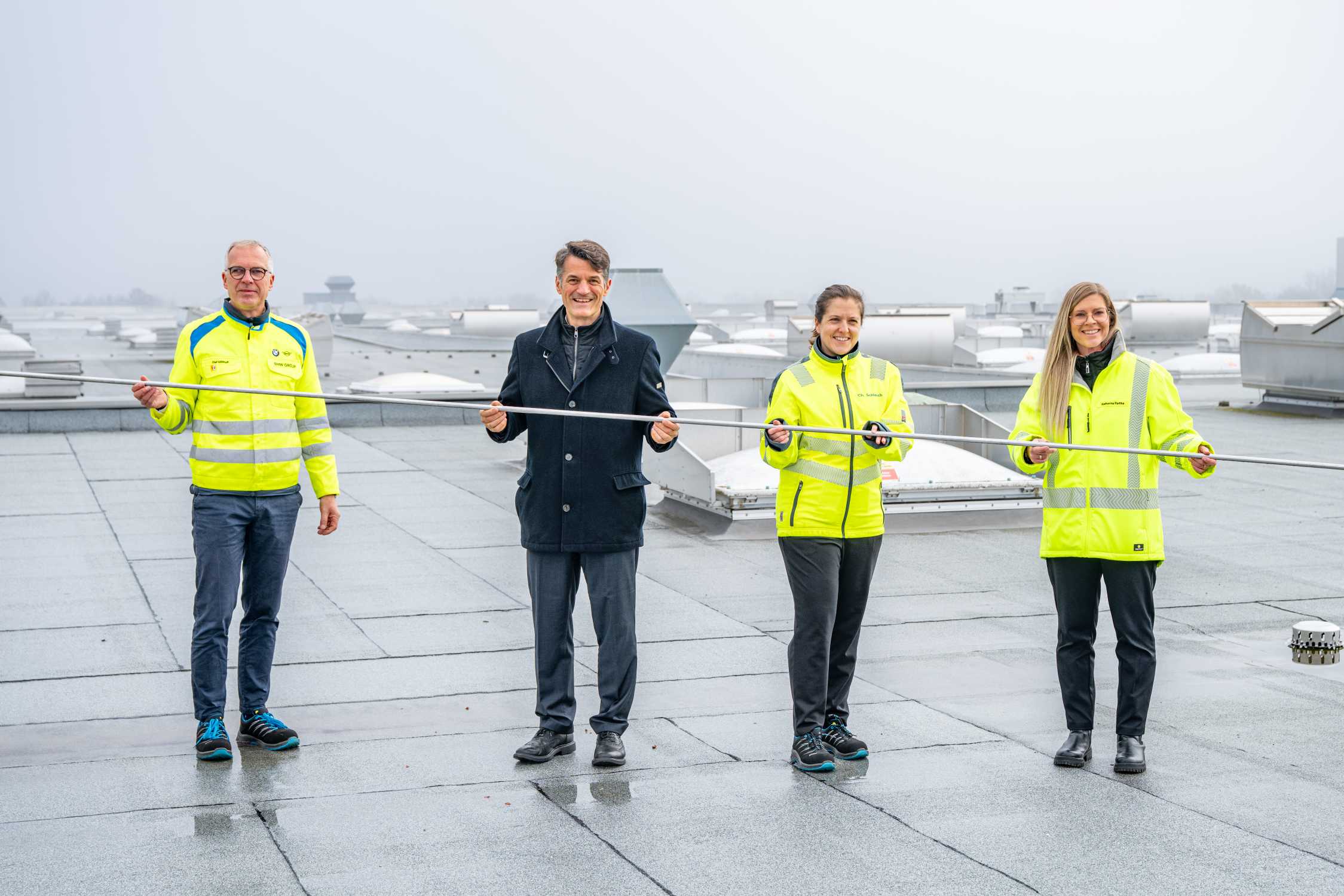 Baubeginn im BMW Group Werk Regensburg: der stellvertretende Werkleiter Olaf Möllhoff verlegt zusammen mit Projektleiterin Katharina Radtke und Prof. Dr. Georg Barfuß (berufsmäßiges Stadtratsmitglied und Leiter des Referates für Wirtschaft, Wissenschaft und Finanzen der Stadt Regensburg) symbolische die erste Leitung für eine neue Wasserstoff-Infrastruktur – ab 2026 erste wasserstoffbetriebene Routenzüge und Gabelstapler für Bauteileversorgung der Produktion im Einsatz (12/2025)