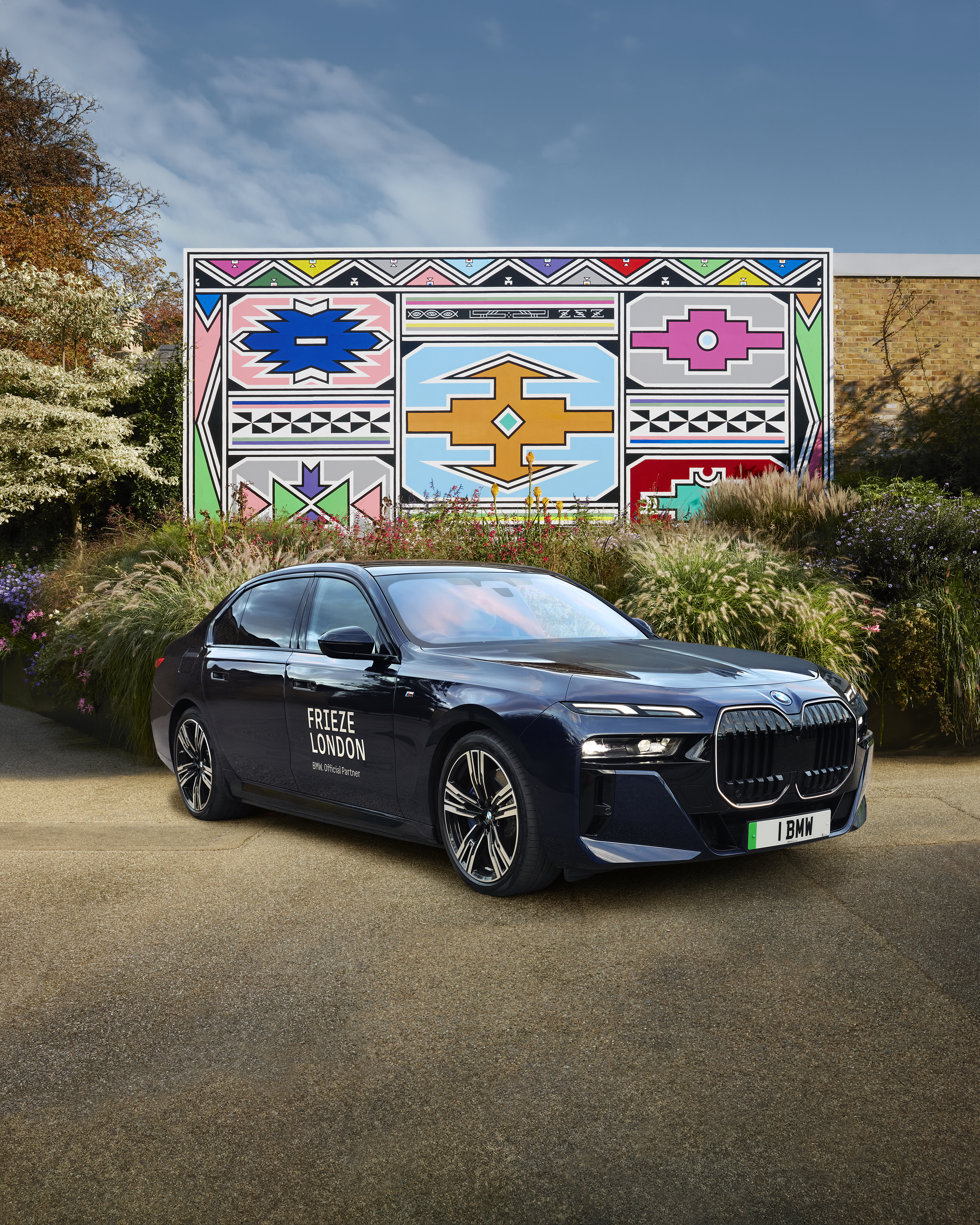 BMW i7 in front of Esther Mahlangu's „Umuntu ngumuntu ngabantu“, 2024. Serpentine North Garden, 4 October 2024 – 28 September 2025. Courtesy Serpentine and The Melrose Gallery. Photo: Rob Low (10/2024)