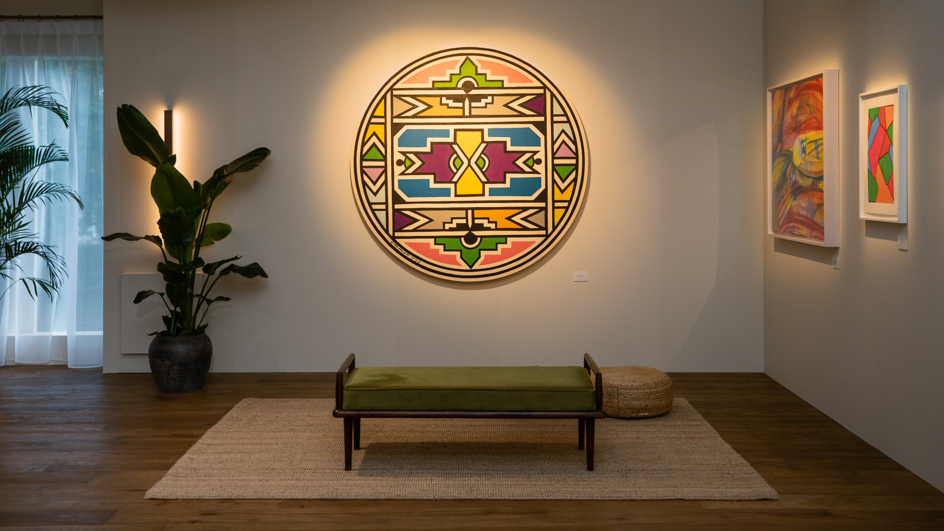 BMW Lounge at Frieze London 2024: Display of Russell Tovey's private art collection in response to Esther Mahlangus works „Ndebele Abstract“ and „Ndebele Abstract 2022“. Photo: Callum Morrison (10/2024)