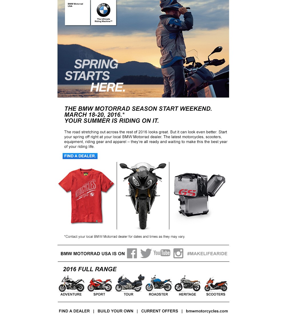 Spring Starts Here – March 18-20, 2016 Woodcliff Lake, NJ – March 17, 2016…BMW Motorrad USA kicks off the 2016 riding season this weekend with a national marketing campaign encompassing cable, digital and social media advertising; national email promotions; direct mail; and dealer events around the country.