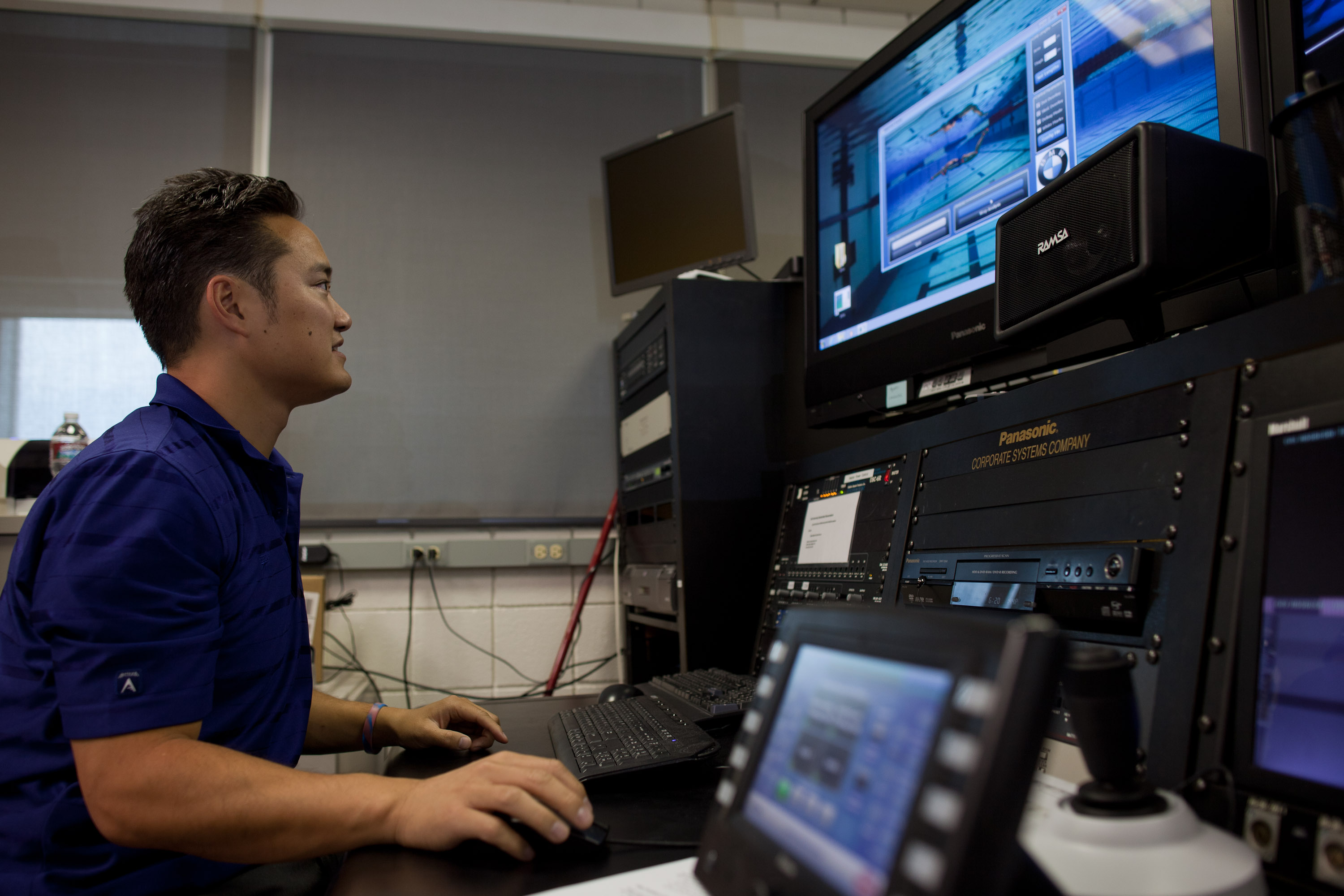 Russell Mark, National Team High Performance Consultant for USA Swimming, analyzes data delivered by BMW's motion tracking system. (08/2012)