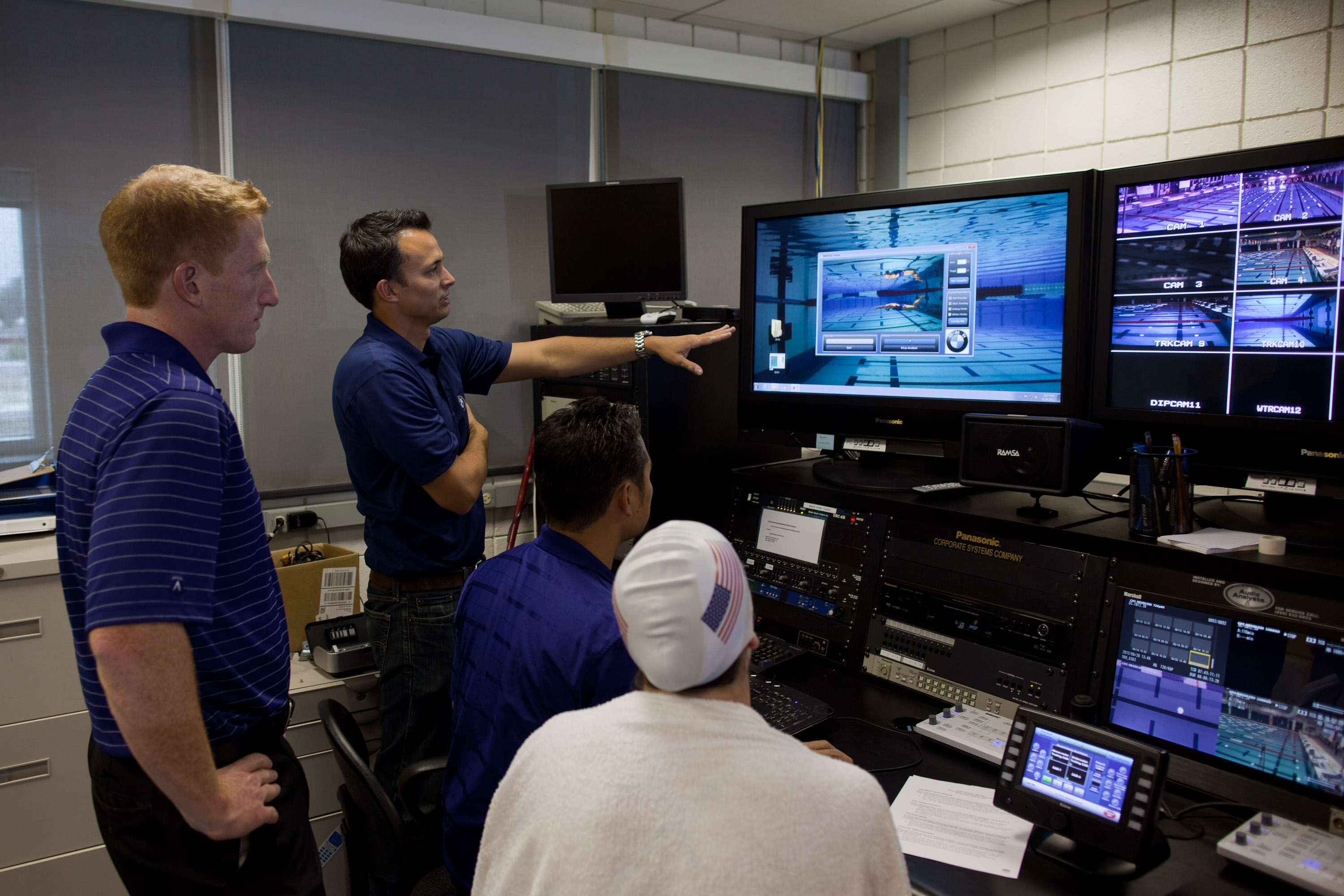 BMW engineer Cris Pavloff reviews and explains results of a swimmer's dolphin kicks with USA Swimming's Russell Mark and Matt Barbin. (08/2012)