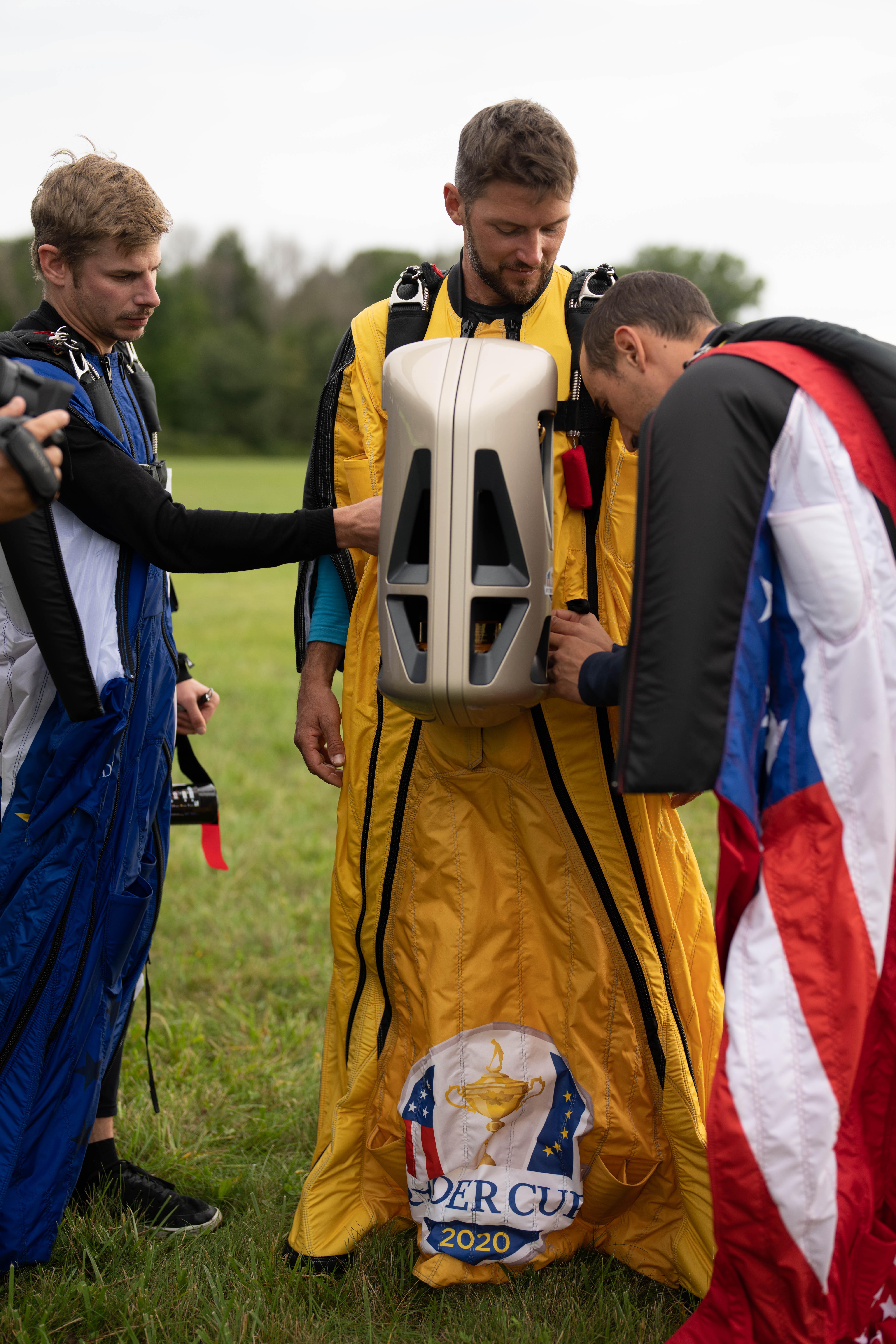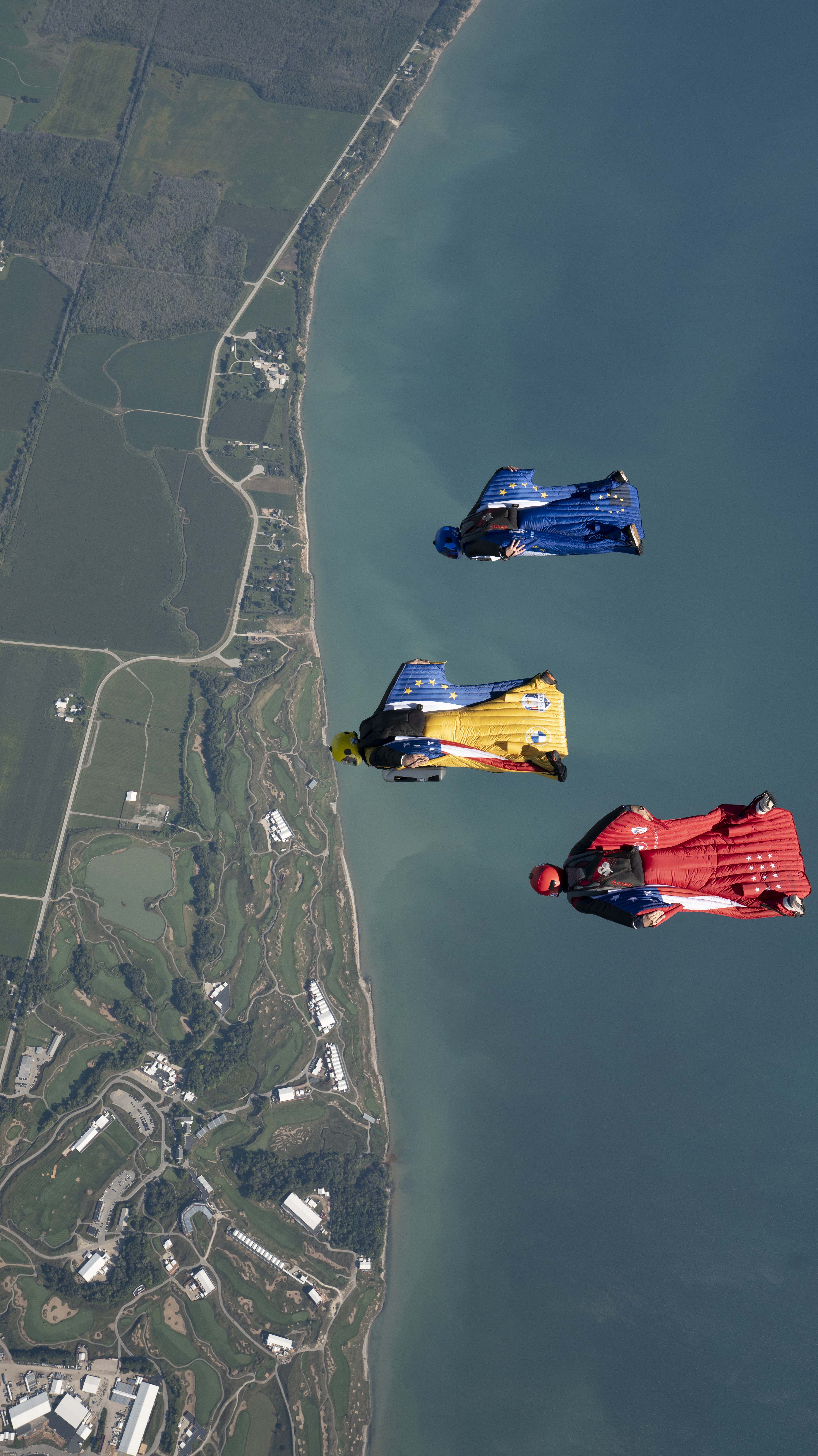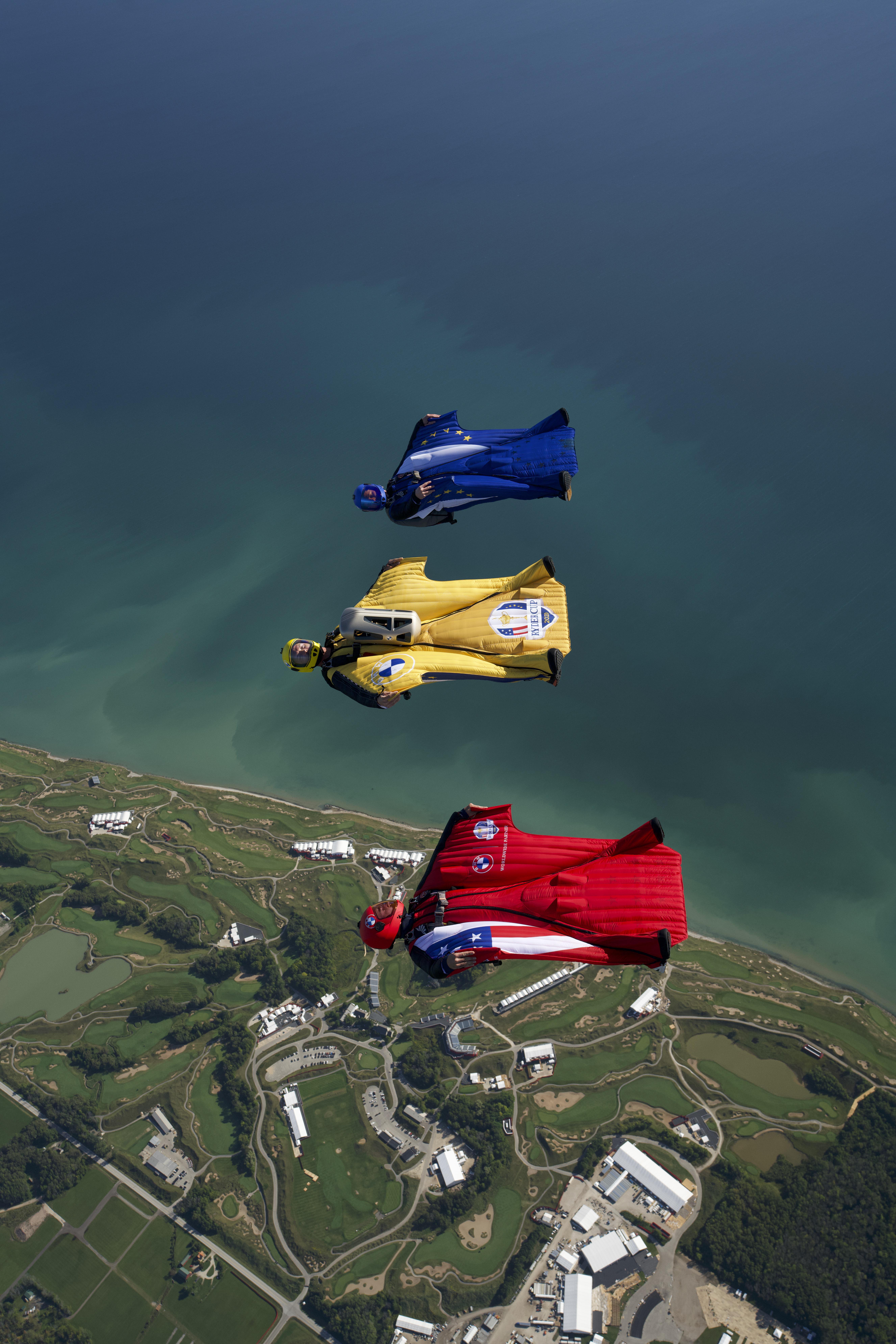 BMW helped kick off the opening ceremonies of the 43rd Ryder Cup matches in Kohler, Wisc. on Sept. 23, 2021 with spectacular aerial stunt to deliver the trophy to the event. Wingsuit pilot Peter Salzmann delivered the Ryder Cup trophy to Whistling Straits ahead of the 43rd Ryder Cup matches in a specially-designed case created by Designworks, a BMW Group company.
