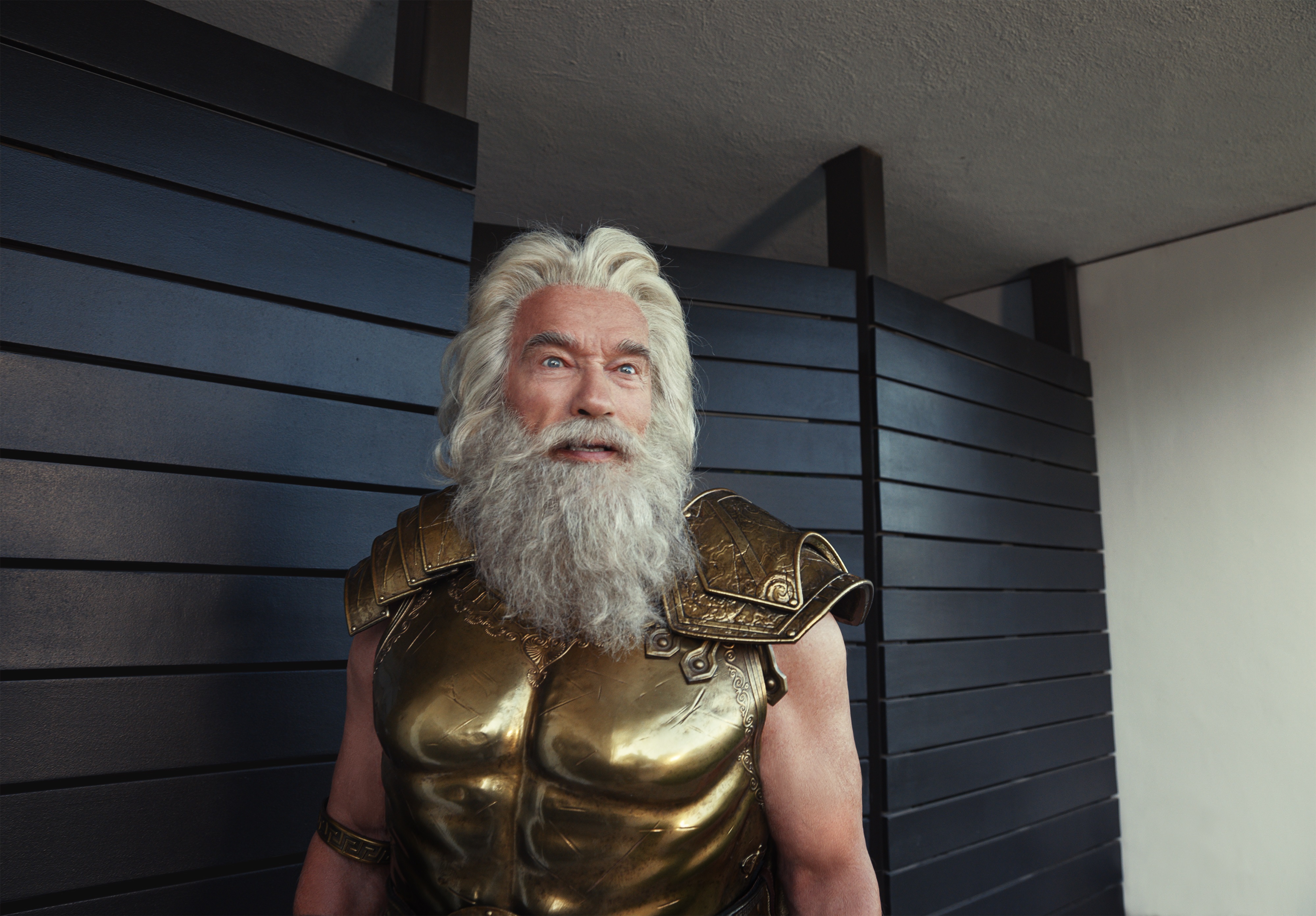 A behind-the-scenes image of Arnold Schwarzenegger as the Greek god of lightning Zeus from a new BMW advertisement which will air during the Super Bowl on Sunday, February 13, 2022. The new creative will support the launch of the all-new fully electric BMW iX Sports Activity Vehicle which arrives in the U.S. next month.